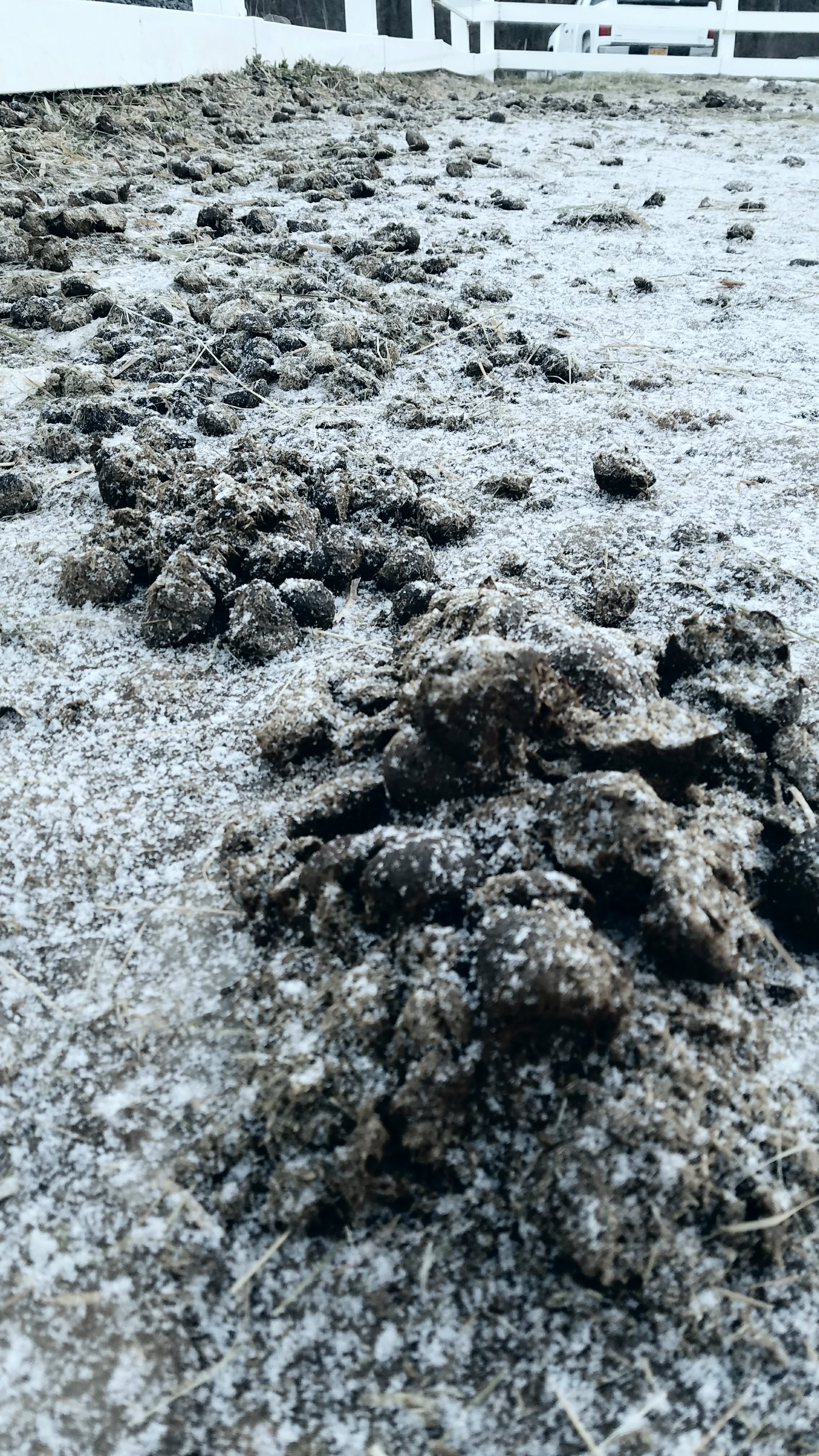 Recently I realized something about myself. One of my biggest pet peeves about winter is not being able to pick paddocks.  The piles accumulate and freeze.  It gets worse with snow because the manure glares at you among the beautiful white powder.
