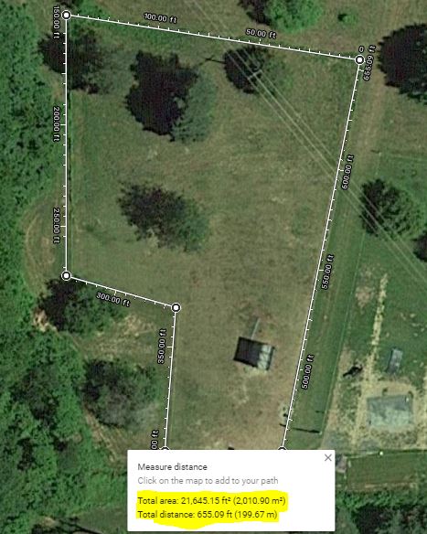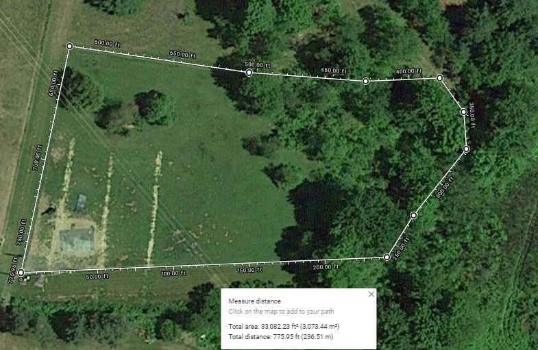 To begin I got a rough estimate of the perimeter. You could use conventional measuring tools or you could do what I did and naavigate to Google Earth. Using Google Earth I found our address and switch to satellite view. I looked for landmarks and indicators of what we saw in our on-foot planning sessions. I right clicked on the map where I planned to place our gate, in the box that opened I selected “Measure Distance.” This feature allows you to plot several points and estimate a distance. I did this for the perimater of our first paddock. It came out to 775 feet, but I rounded up to 800.