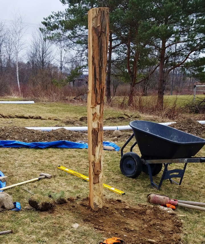 Once I had the space entirely cleared I could begin the post work. I began with the corners. In my mind once I have the corner posts set I could develop a clean straight line. I chose the spot for my first post and began digging. Again, we had no power tools. The only equipment I had was a post hole digger, shovels, and an ice auger that Zac’s friend loaned us. Though the ice auger isn’t necessary it was actually very handy for digging out the first 18 inches. Once I hit rock, however, I had to fight. To get deeper i used the post hole digger and a large metal spike to break up rocks. I set my post securely and moved on to the next.