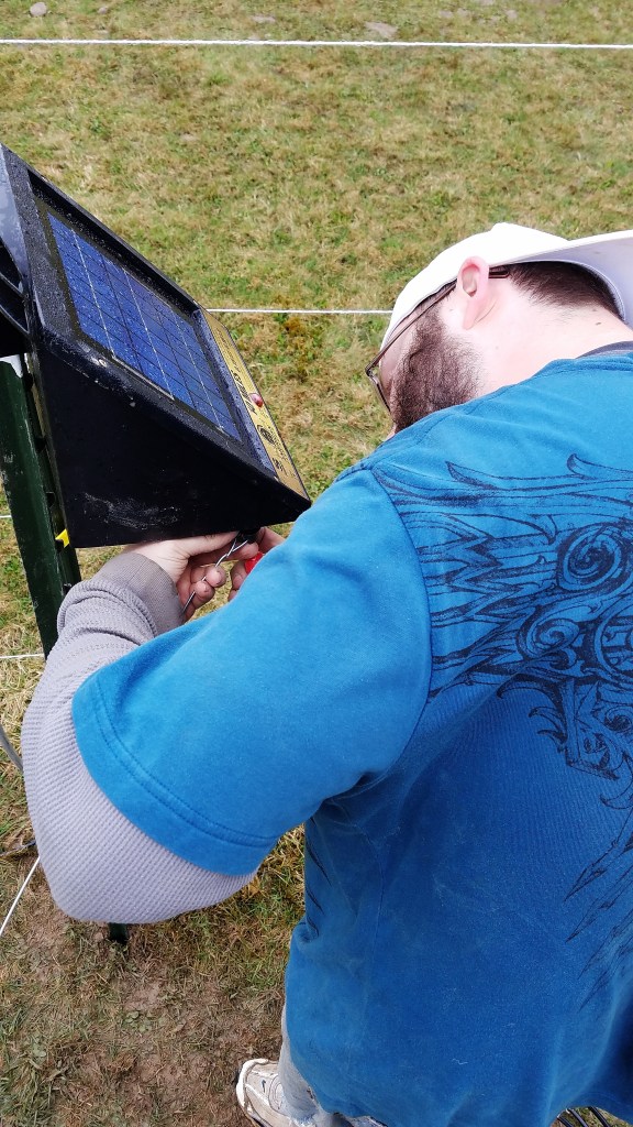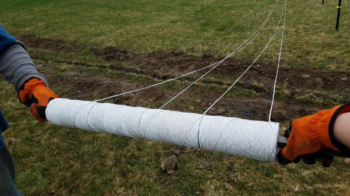 With the gate hung Zac and I thought it easiest to run all four fence wires at once. We put the rolls on a rod we had laying around and used gloves to prevent rugburn. We secured one end of the polywire fencing to one of the gate posts and began walking. At each corner we put the poly wire in it’s respective insulator and kept going. We took a second trip around the paddock to place the polywire in all of the insulators and make sure there were no criss-crossed sections. We finished up by securing the ends to the other gate post.