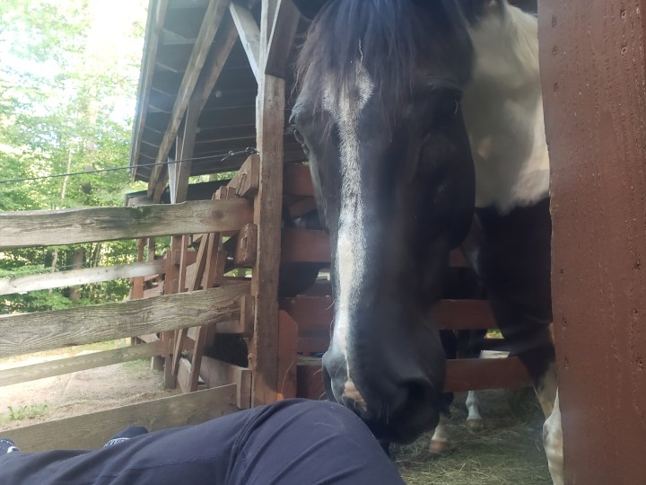 Just as I was falling asleep I felt a gently nudge on my legs. Nahe came to investigate me in the chair to make sure I was alright. He and I cuddled quietly like that for a while. He stood over me and kindly asked me to scratch his face, neck, and chest. When he was satisfied he returned to his hay net.
