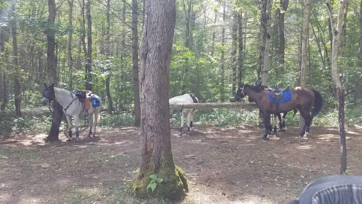 There was a hitching post and picnic tables so we tied the horses, took off their bridles, and let out their girths while we sat for lunch. It was a busy area and a family not-so-subtly waited for us to finish so they could use the picnic tables. We finished up and the group of people stood by their cars watching us as we mounted and left.