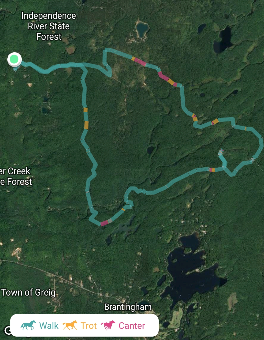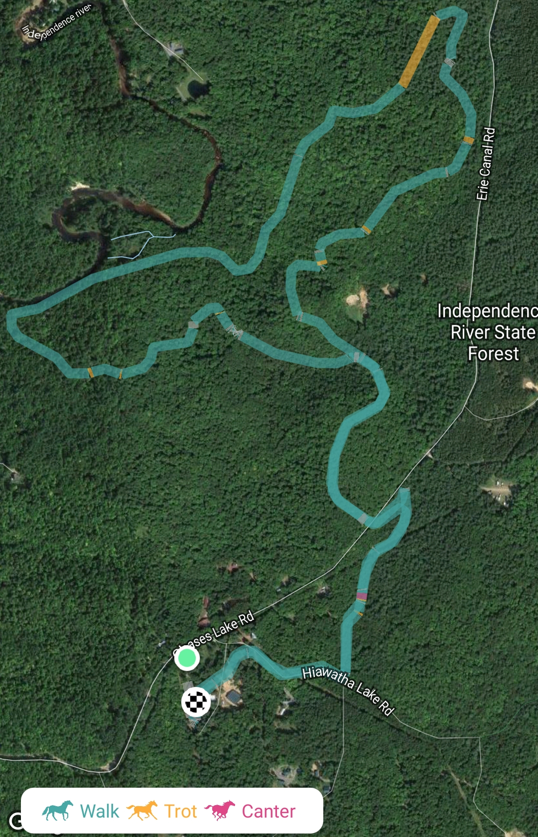 In fact, let’s take a look at our most recent hunter pace (The Pace That’s Out to Get Me) at Landsmankill Trail Association. The pace was about 8.4 miles long. Equilab allows us to look at the pain view or the Google Earth view and tells us how many miles we traveled at walk, troy, and canter (and the average speed).