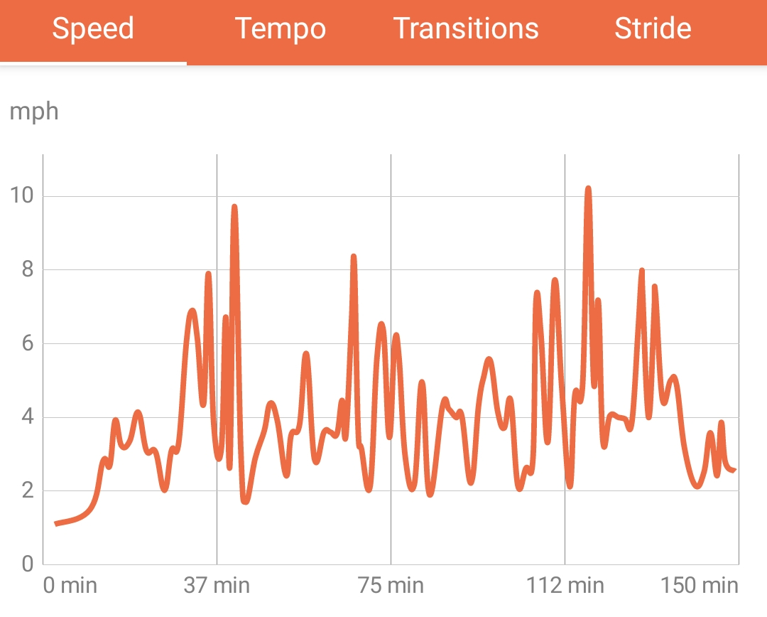 If you look into the detailed stats we can begin to look at speed, tempo, transitions, stride, and elevation. Below I’ve shown our view of speed, tempo, and elevation. You can see I turned the app on as we mounted and walked to the starting area. We waited for a few moments and really got going around 10 minutes in. The beginning of the pace had terrible footing so we spent a lot of time walking at first.