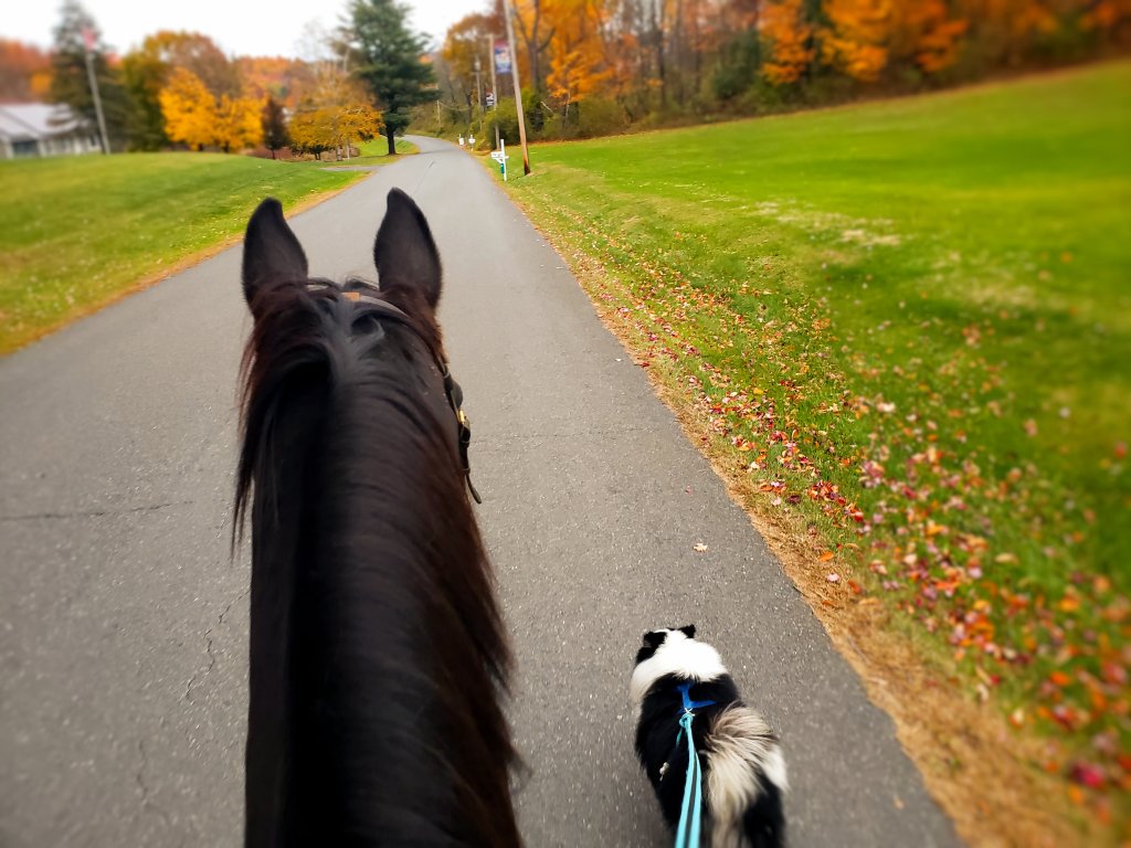 We had such a wonderful ride I chose to cool him down by walking him down the street. Bardi had been doing fabulously as well so he came along for our walk. I keep Bardi harnessed on a long lunge line and he does a good job keeping an appropriate distance. Tiger is calm and well-behaved and careful of the little fur beast walking with him.