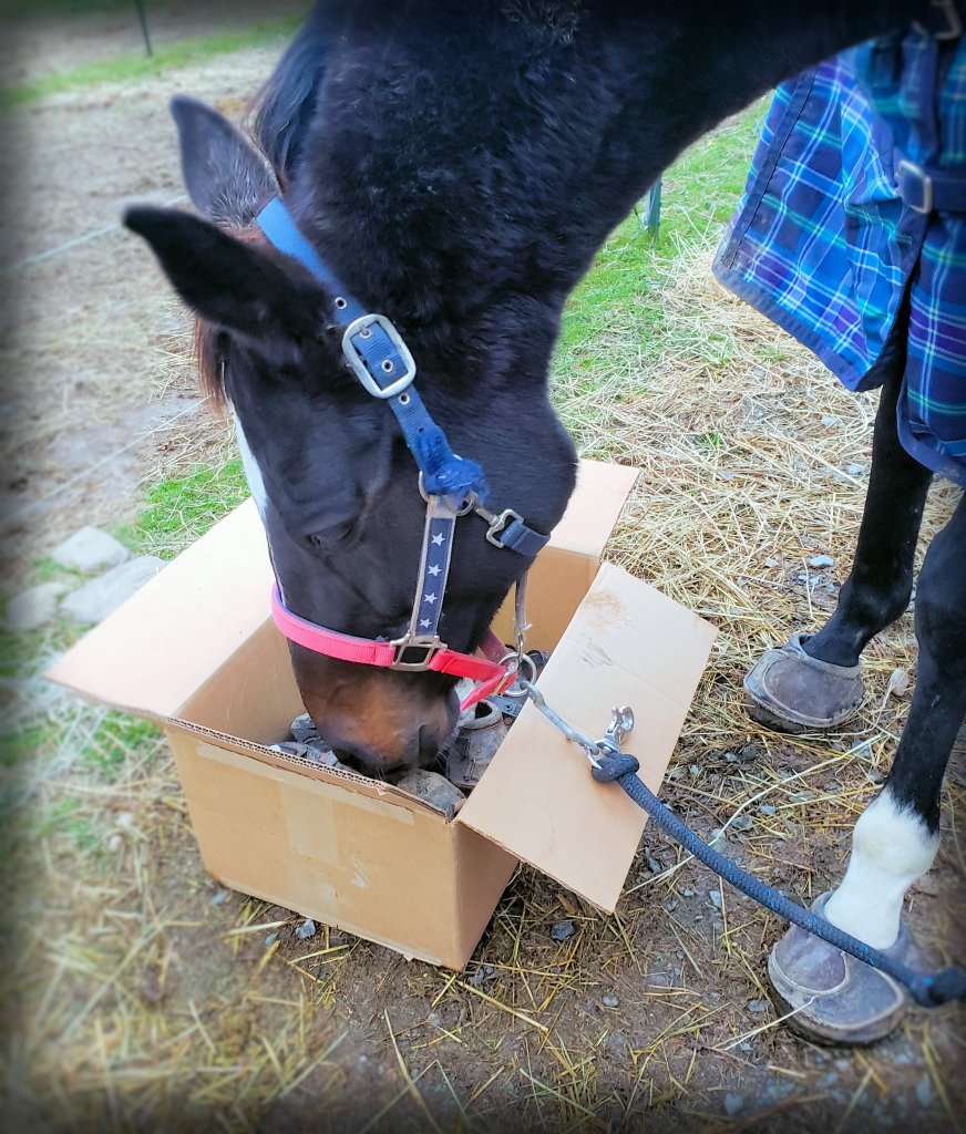 A wonderful friend of mine brought over a massive box filled with hoof boots. We spent time trying on different sizes and different styles. Both boys were very happy to be given so much special attention. Tiger especially loved the session as he picked through the box himself. He ended up picking the WHOLE box up in his mouth and held it there as if to say “I’ll take ’em all.”