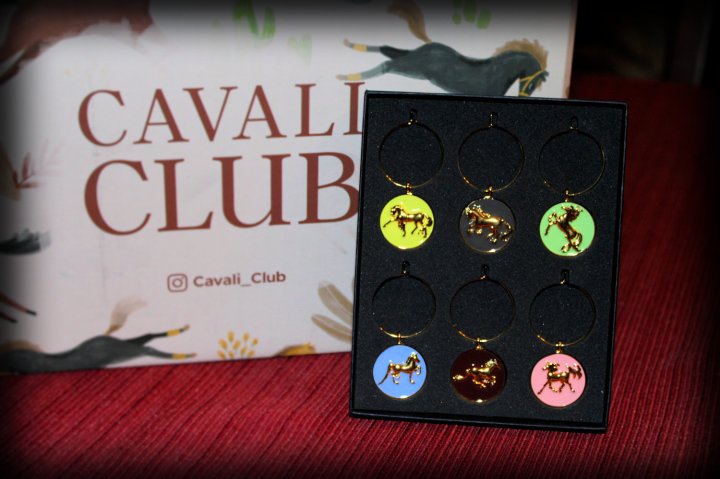 I was greeted next by a medium sized black box. In Spring 2020 we received a beautiful horse head wine stopper. Now for spring 2021 we received a beautiful set of 6 wine glass charms. Each charm is a different color and has different artwork designed by Eliza Frye.