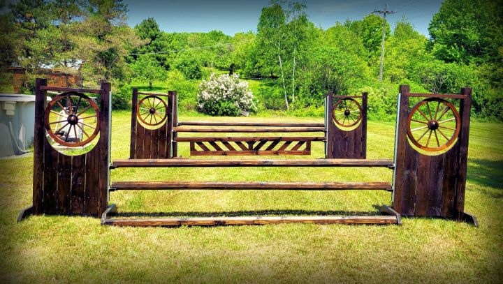 For the June show I am featuring a red mahogany wagon wheel set. The setup is designed for a line; a vertical to an oxer. The set includes two sets of wagon wheel standards, one set of schooling standards, a gate, five poles, and five sets of steel jump cups. If I had an arena I’d be keeping it for myself in a heartbeat.