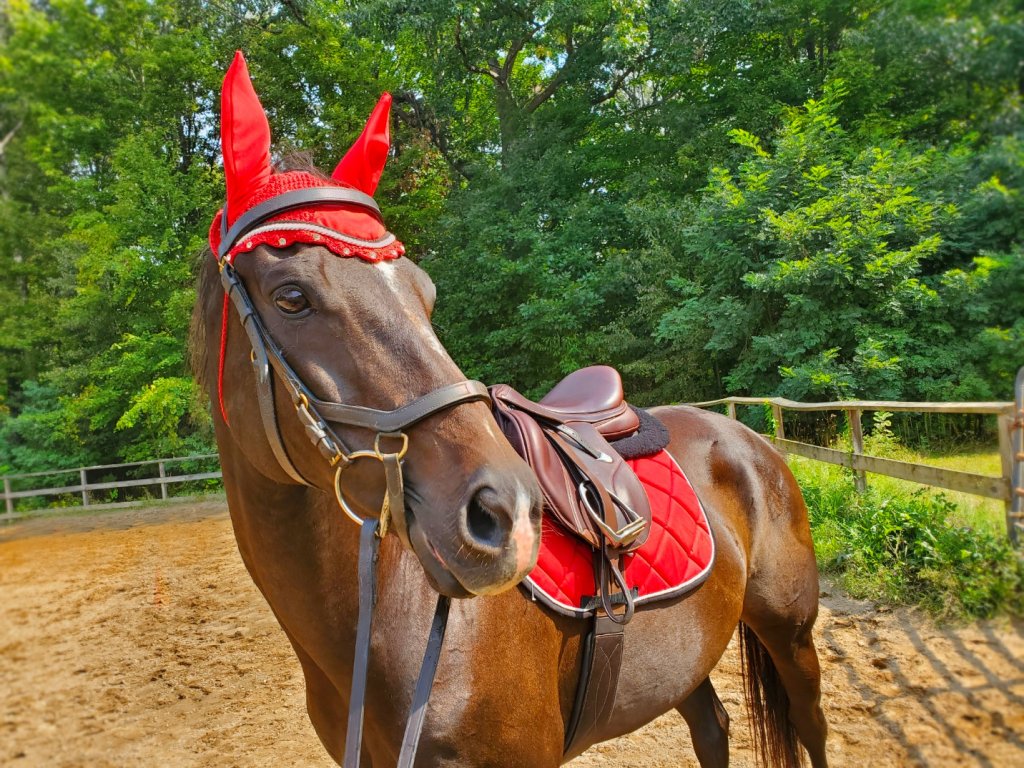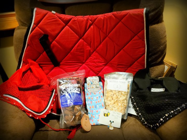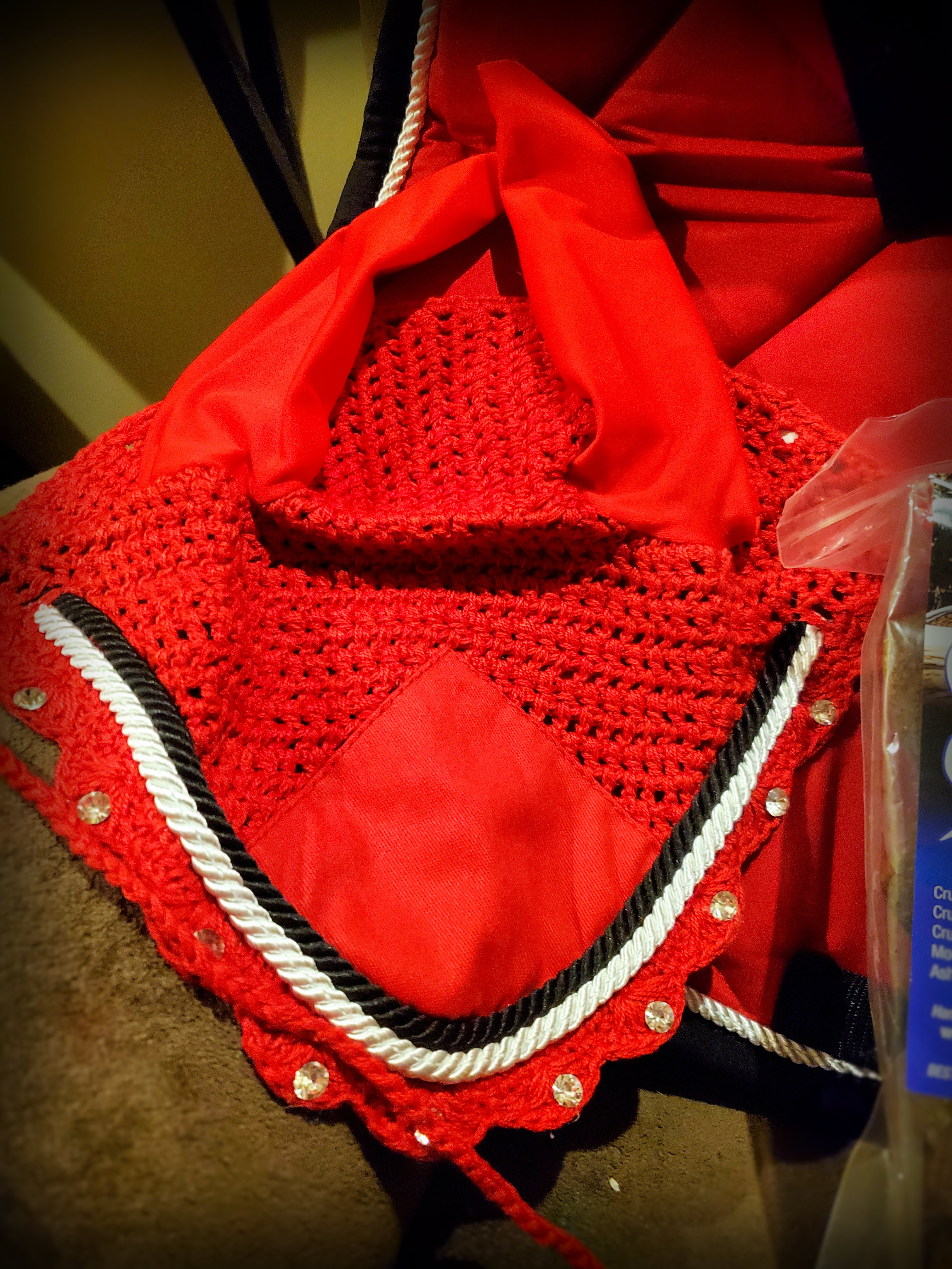 Last but most certainly not least I received a beautifully made saddle pad. The pad is the match for my new red ear bonnet and both were designed by Tack of the Town. The pad itself is worth about $50. The set is going to look lovely on either of the gentlemen!