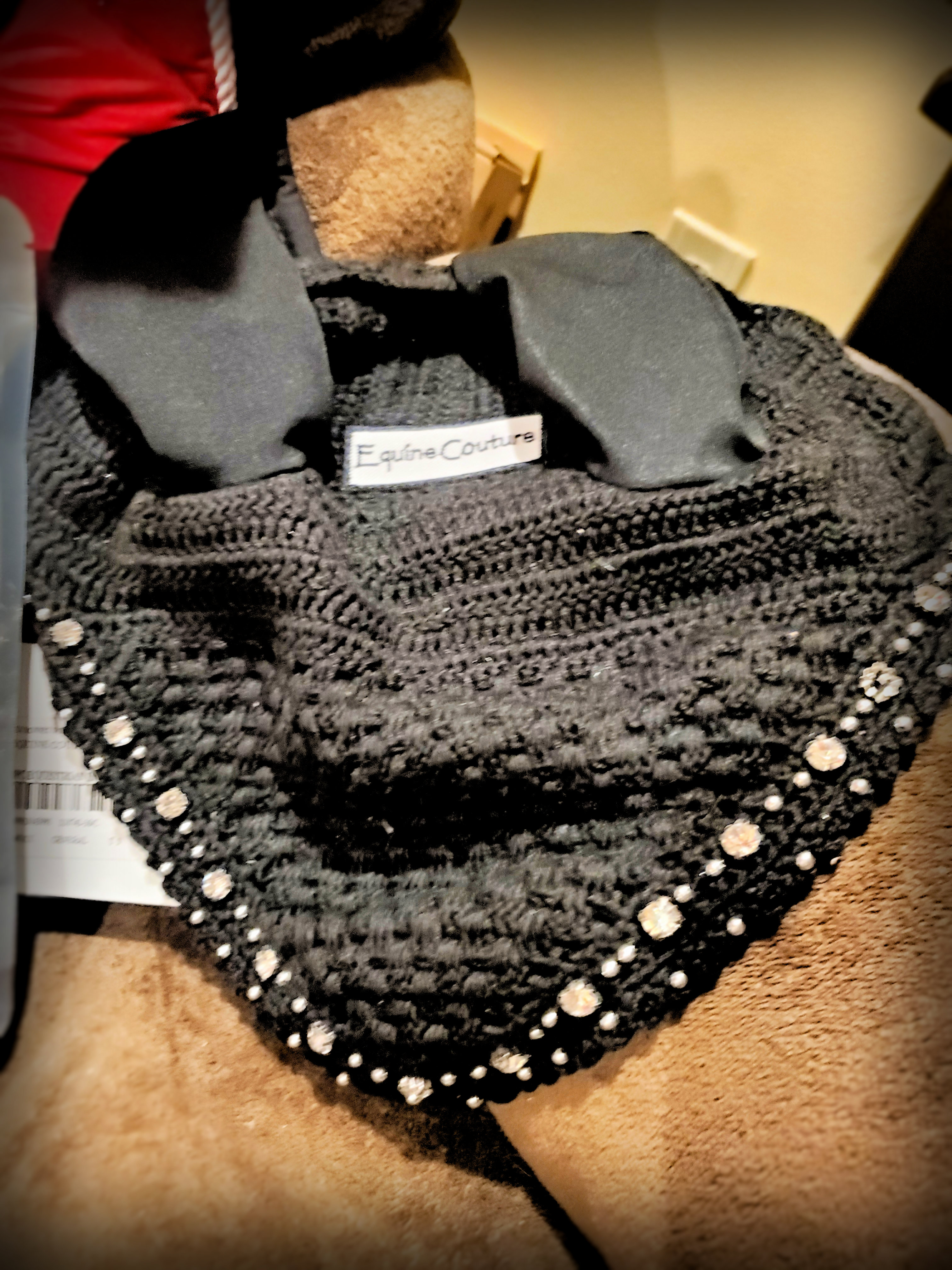 The next item(s) caught my eye with a shimmer. Out of the box came both a red with black and a black ear bonnet! Both bonnets are beautifully crafted, soft, and both have bling! Each of these are about $25 normally.