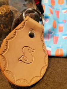 The first item I received was a handmade leather keychain with my initial (both first and last of mine are S so it works). Ironically I still don’t have anything on my set of truck keys so that’s right where it went.