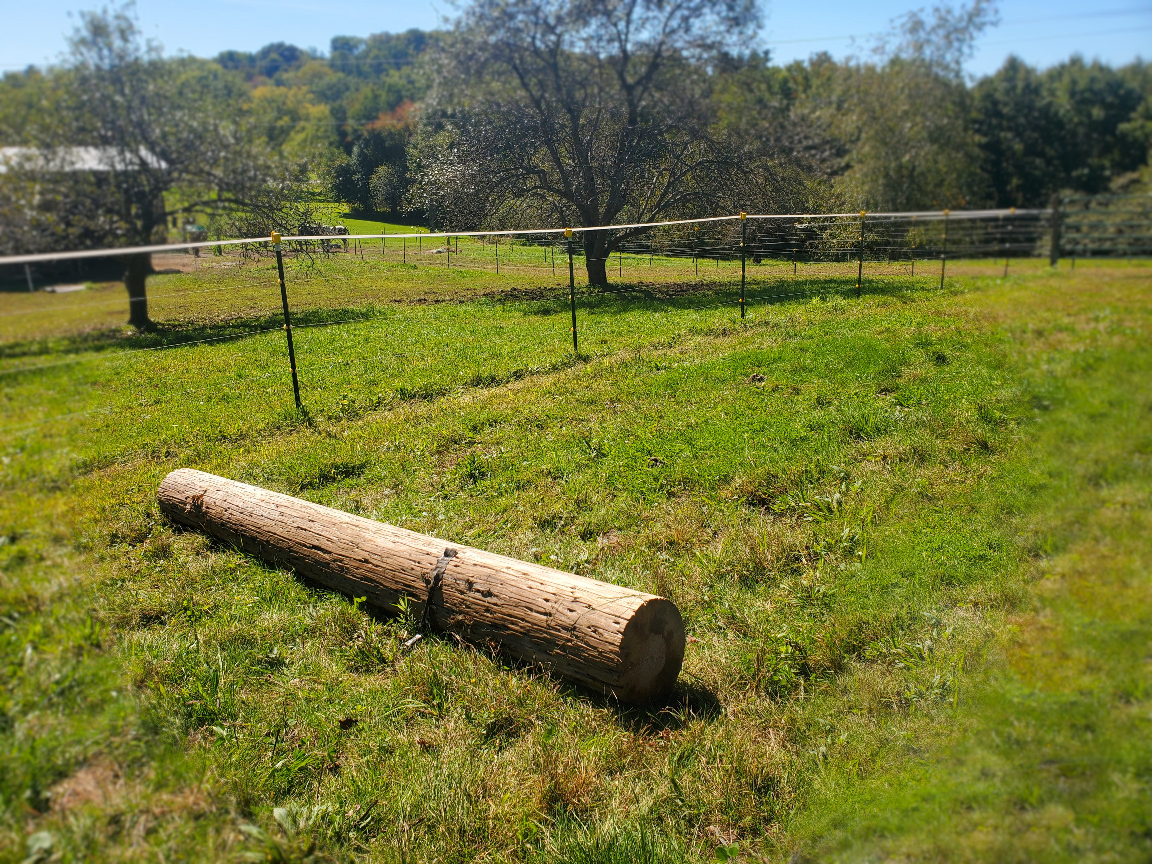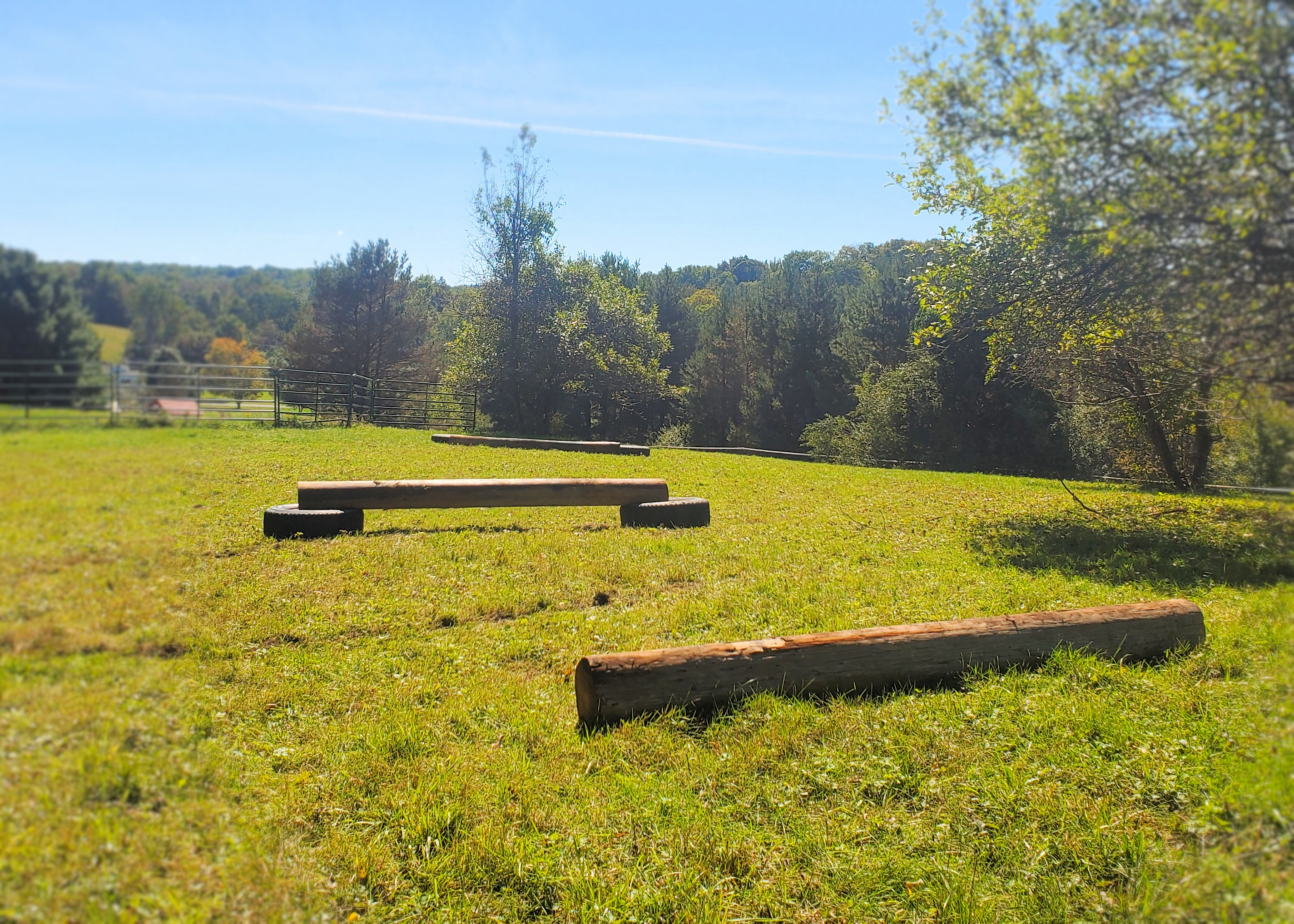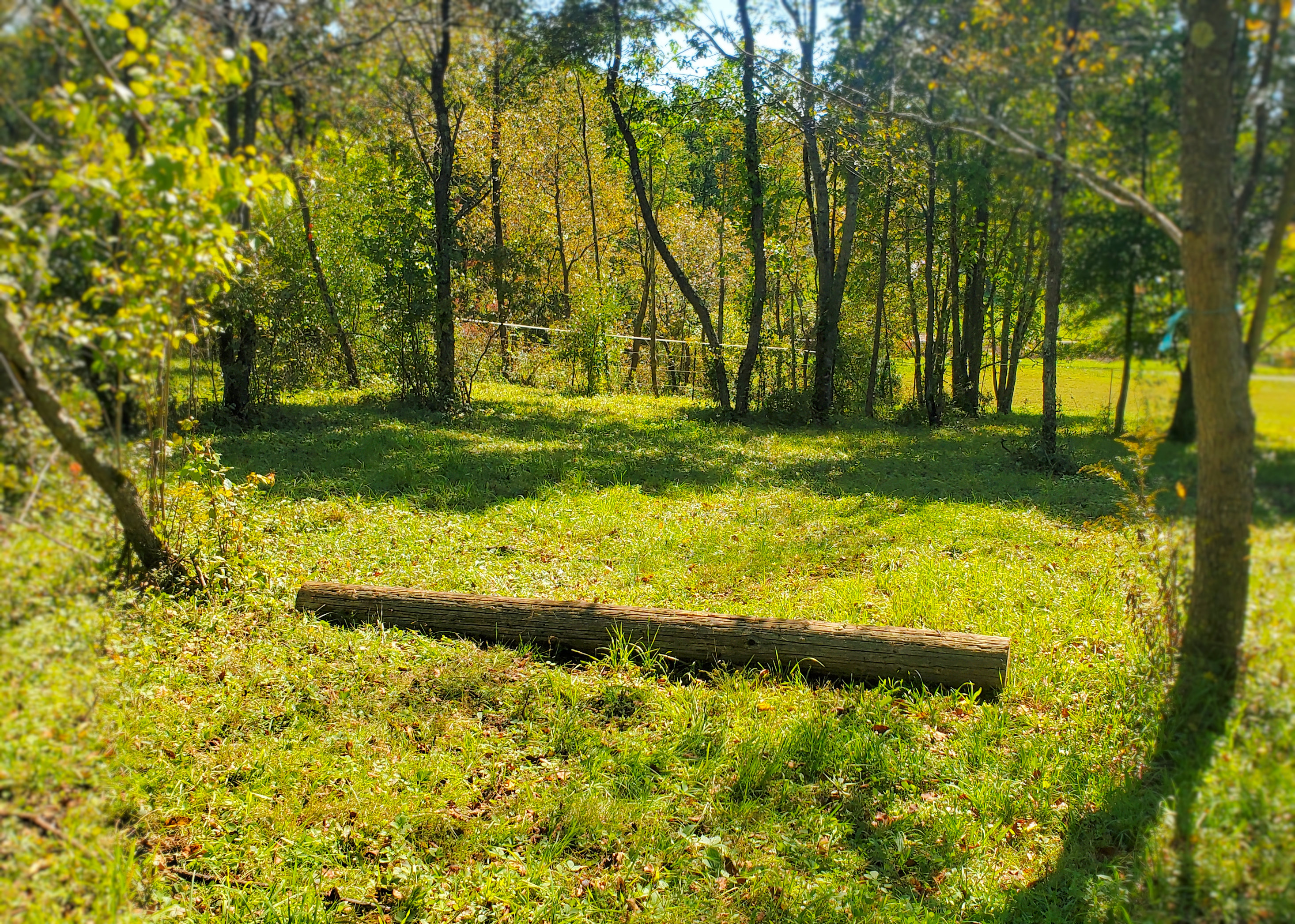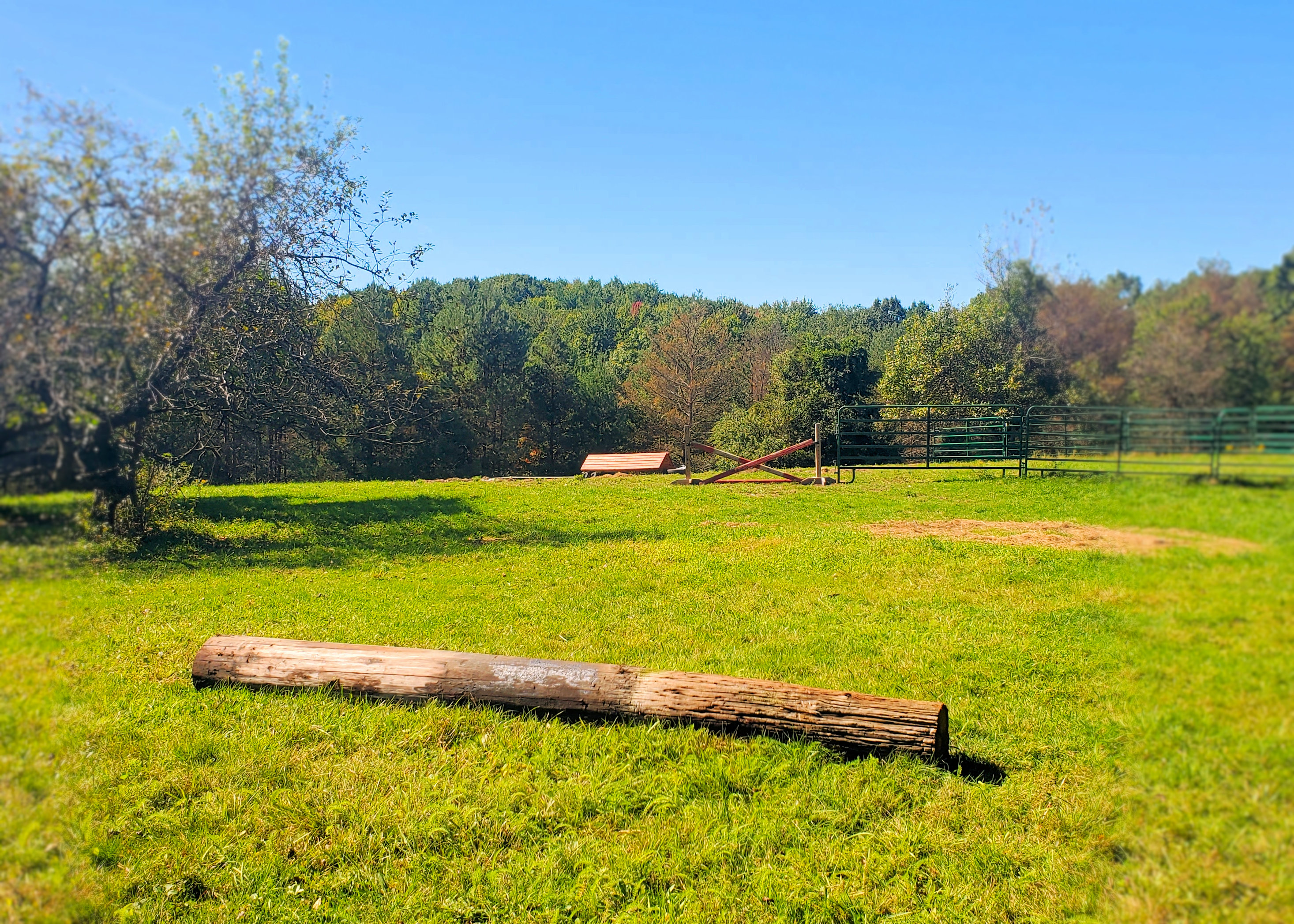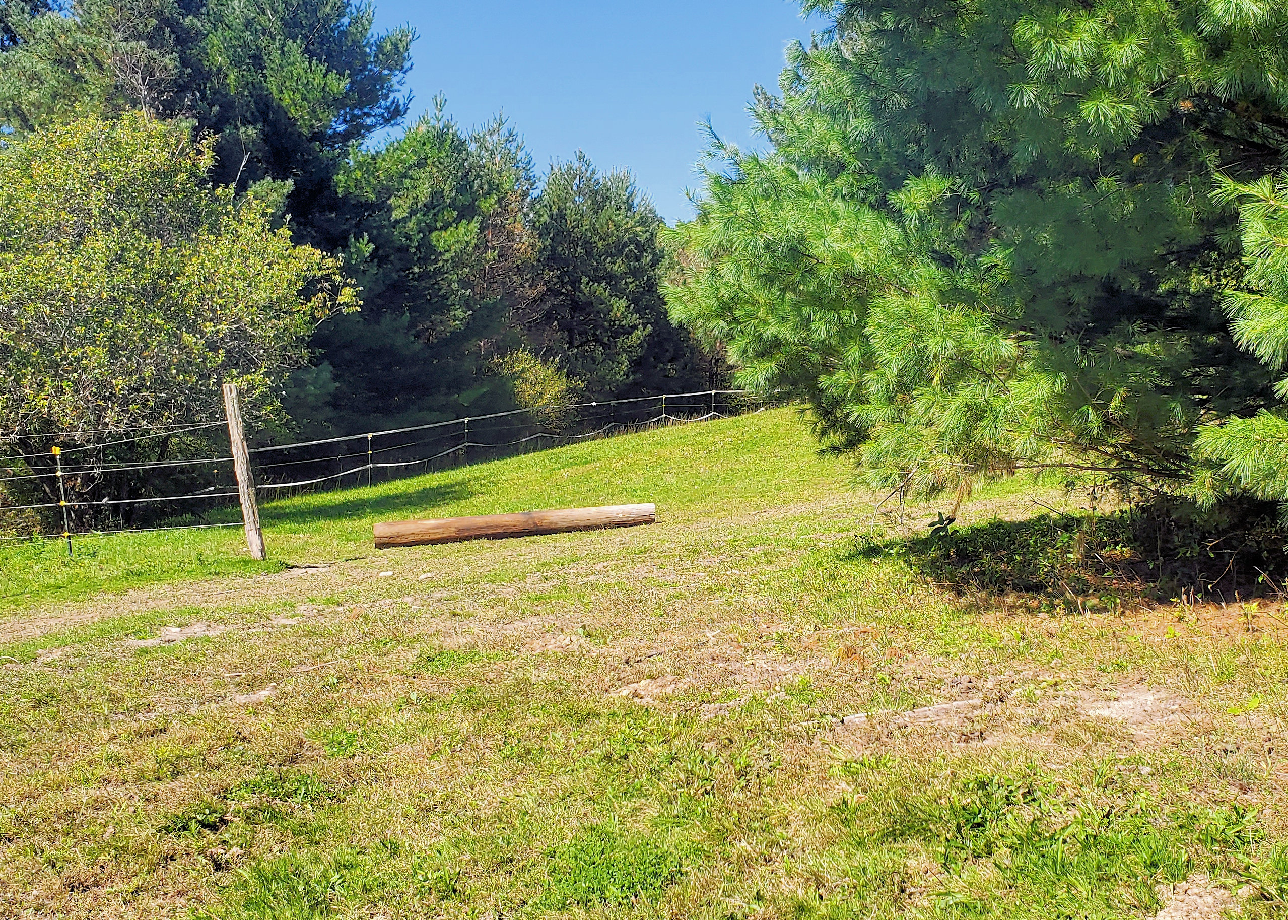 Rather than building a bridge, I turned my 12 new logs into a small cross-country schooling course throughout the property! I made sloped jumps, singles, doubles. Some jumps enter into the woods, some exit the woods into a clearing. Given my affinity for trees, I made sure to put some logs between narrow tree openings, too. I still have lots to do before I’m satisfied but I’m off to a great start.