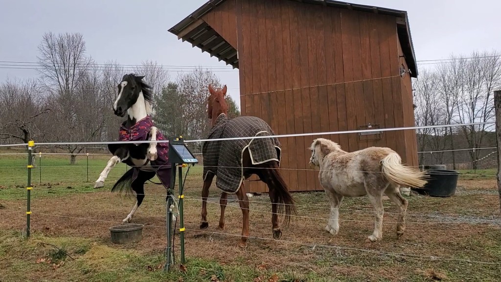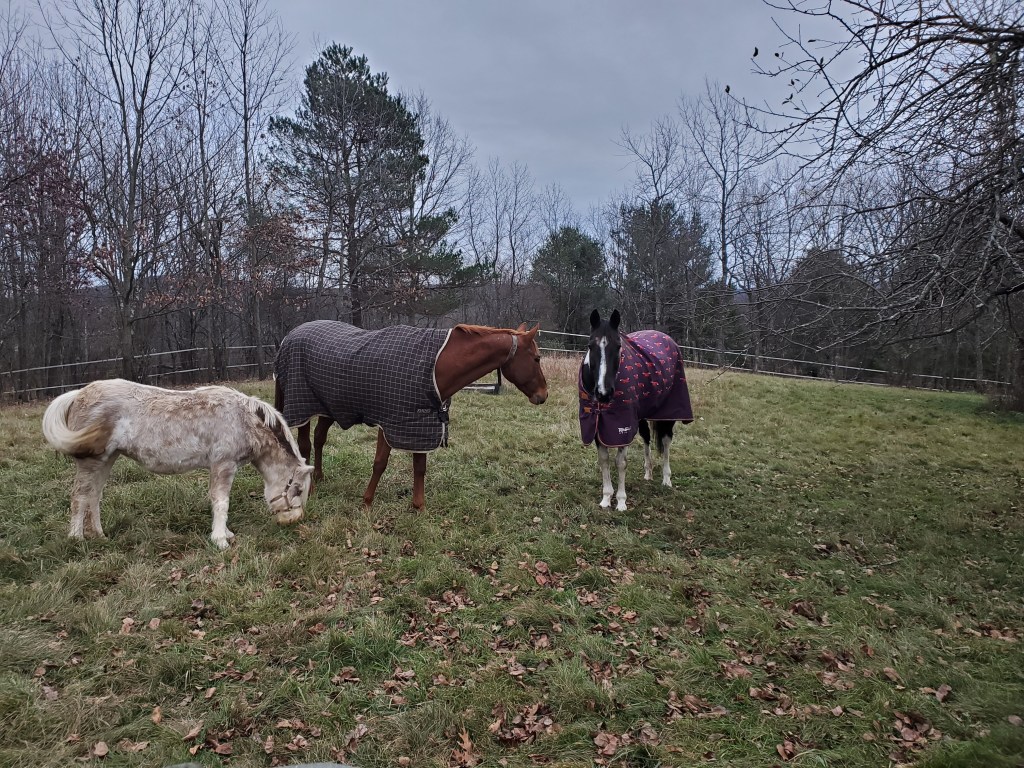 At the end of October I brought my friends horses home to enjoy our acres of fields. The year was very good for the pastures and they grew healthy and strong all year. The girls (Pony with her muzzle) settled in quickly and were in heaven.