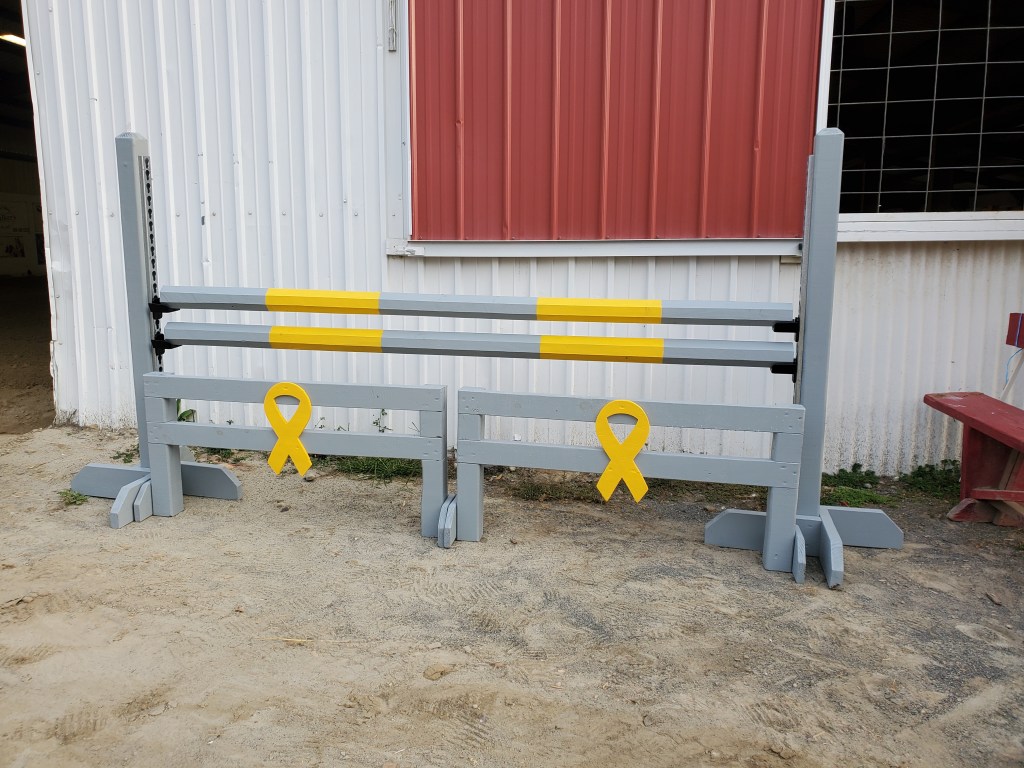 Toward the end of summer, we also learned of a young lady who was just diagnosed with a brain tumor. A benefit horse show was organized and my friend raffled off a horse jump that I designed. Grey symbolizes brain cancer while gold symbolizes childhood cancer.