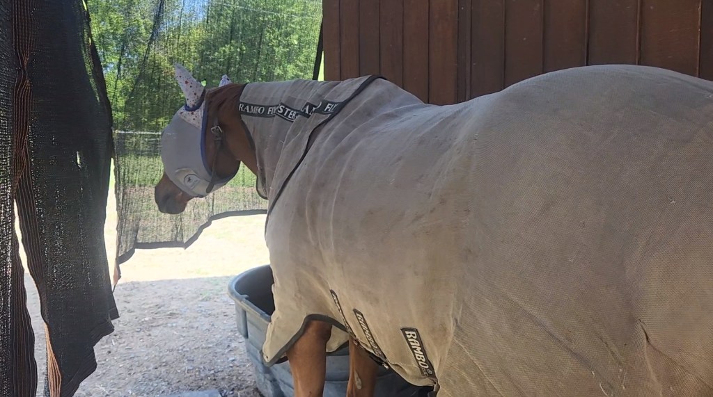 Nahe is unfortunately already experiencing his usual seasonal allergies. With the help of the curtains, he has a place to go to stay cooler and with fewer bugs. Soon we will also have a fan to move the air inside to further keep the bugs off of him. He also wears fly boots, a sheet, and a mask.