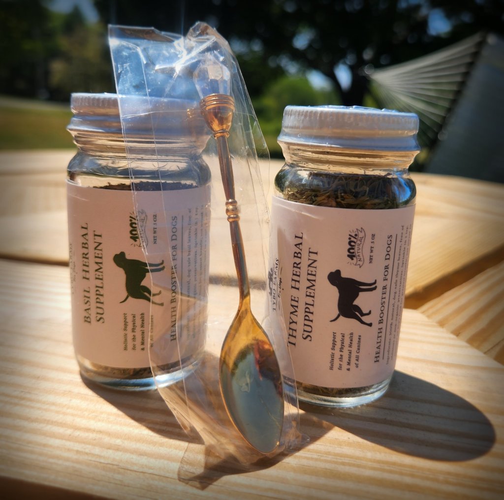 We kept finding more and more items in the Spa Dog box! Next up we found two glass bottles and a small metal spoon. One container has thyme and the other has basil. To my surprise both herbs can be good for dogs, helping to repel parasites and illness.