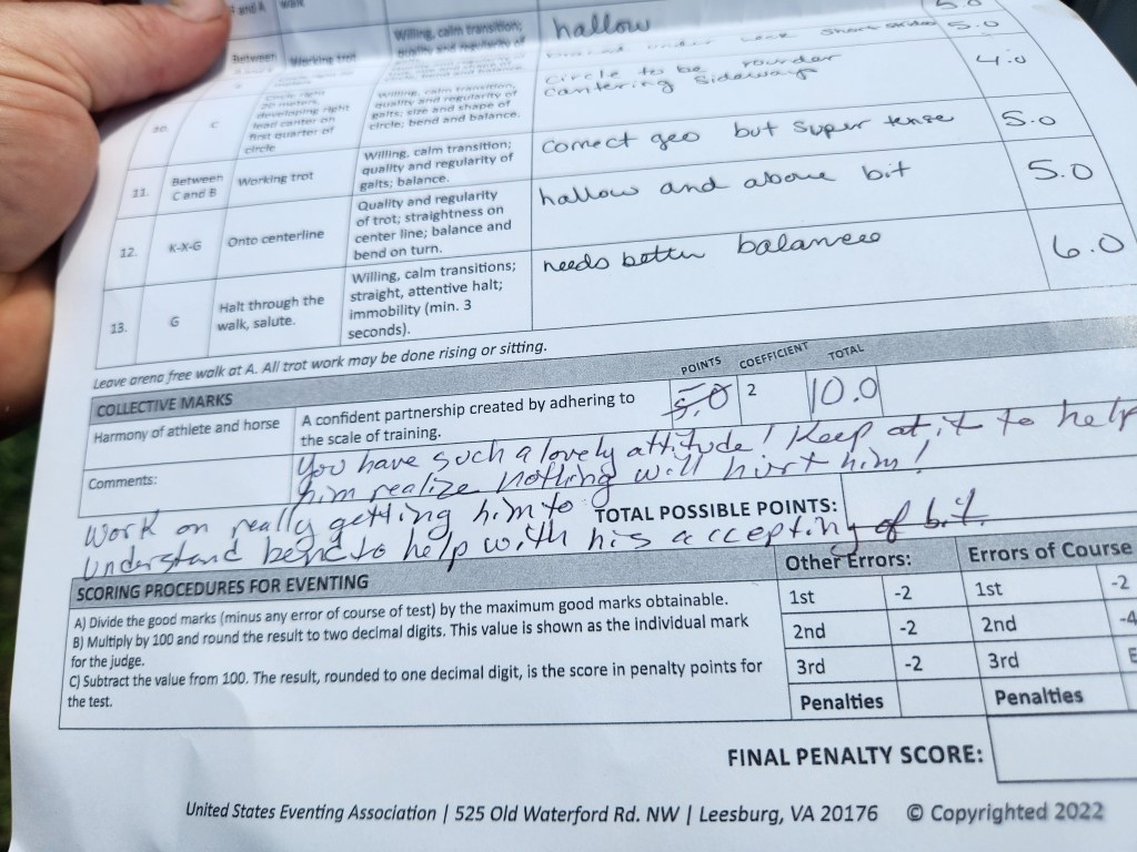 We entered the dressage ring and Stanley was super tense. Head high, far above the bit. Short stride. In essence a bundle of nerves. He listened to every gait cue…walk, trot, and canter. Even landed both the right lead and left leads. He ignored most of my other aids. He refused to bend through his ribcage, and wouldn’t move over when we proceeded down the 2nd track instead of the edge of the ring. We got through it despite his stress. I gave him some love and we moved on with our day. I knew we blew it but it was excellent exposure for him. We also had some great moments that show improvement over our first test.
