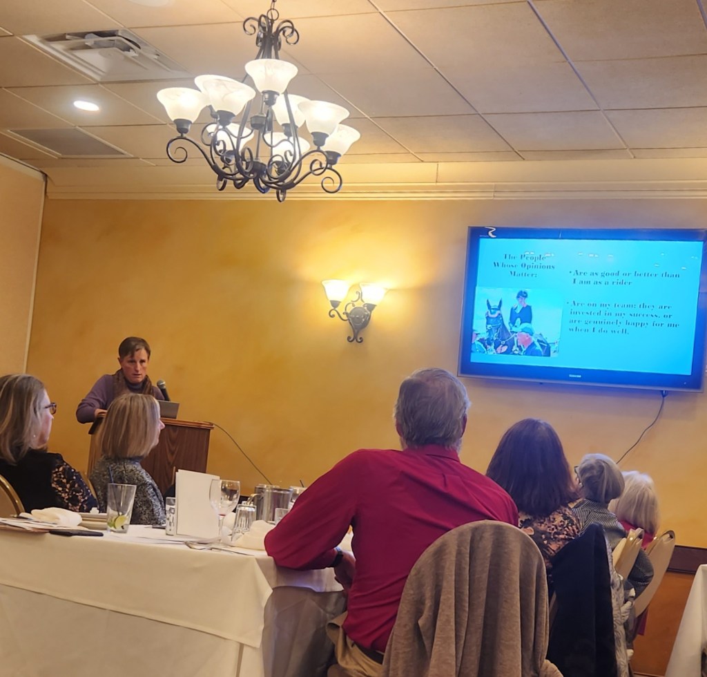 In the same week ENYDCTA hosted their annual banquet and awards ceremony. It was held at a local restaurant and we hosted Andrea Waldo as the keynote speaker. Andrea wrote my favorite book, “Brain Training For Riders” (The Sunday Review: Brain Training For Riders by Andrea Monsarrat Waldo). After dinner and Andrea’s talk, I approached her to sign my book. I nervously talked her ear off as I told her about how this book changed my life. Over the years I had taken a few scary falls that had built up tremendous anxiety in me, and this book turned it around. I also told her about my spill with Stanley (the boot is a real talking point).