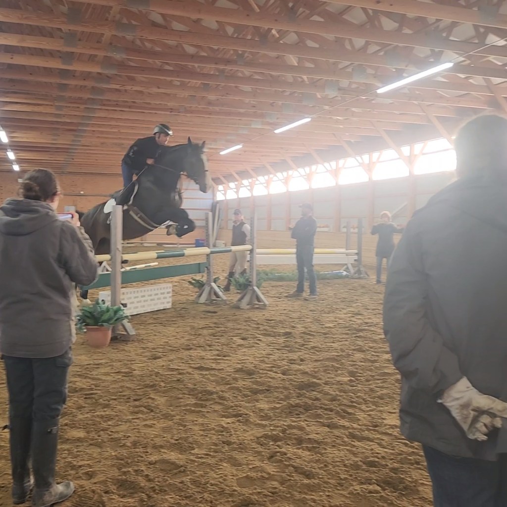 For two days I watch Boyd work with green horses and seasoned horses alike. I was able to witness people grow. I really like that Boyd has a defined system. I recognized that system from May, but his exercises varied day to day. I enjoy his rideability exercises. And he had everyone warm up over a vertical in both directions, and an oxer in both directions. Horses then learned about combinations, liverpools, working with control inside the indoor arena with more limited space. At the time I was still walking around in my medical boot, but I managed to truck around and set rails, pick up poles, and reset the course.