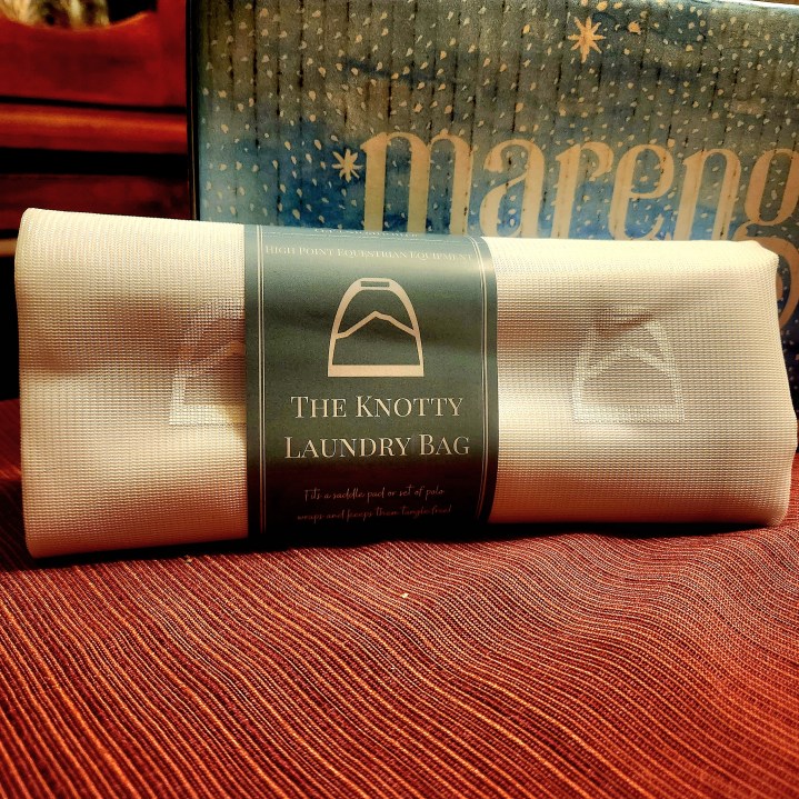 Finally, I came upon The Knotty Laundry Bag. This is a 26″ x 26″ mesh bag made to protect 1 saddle pad or a set of 4 polo wraps in the laundry.