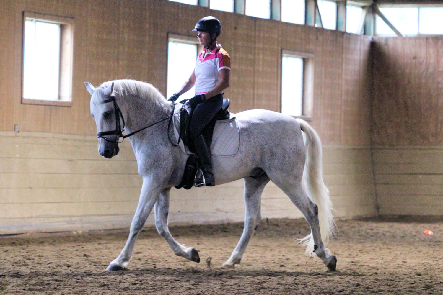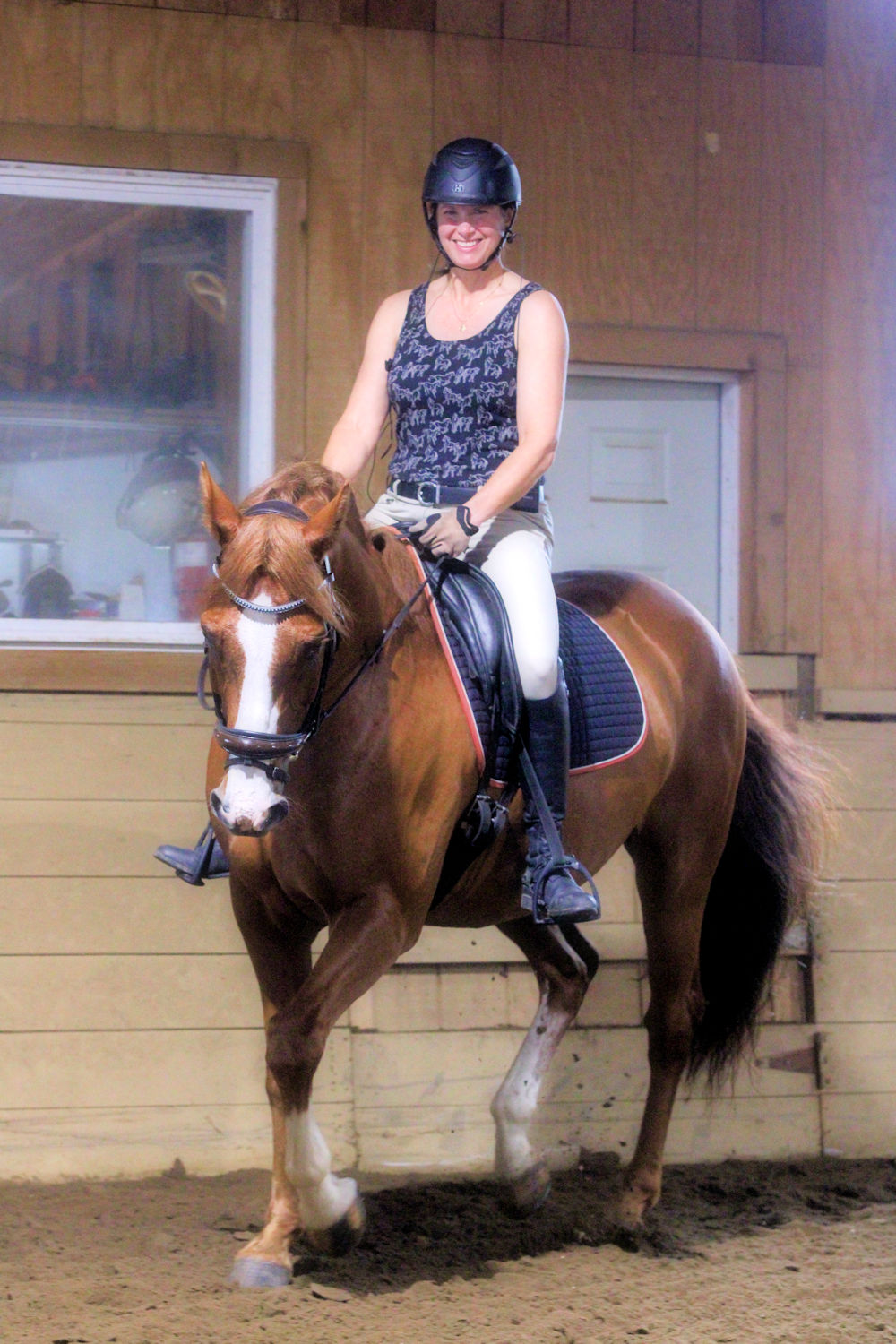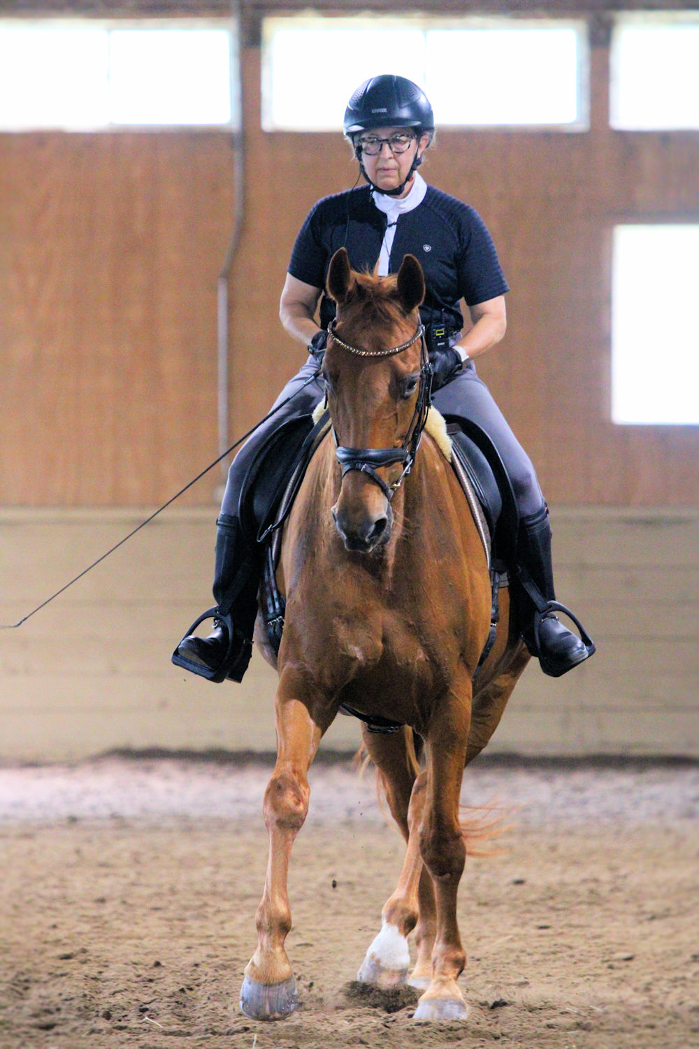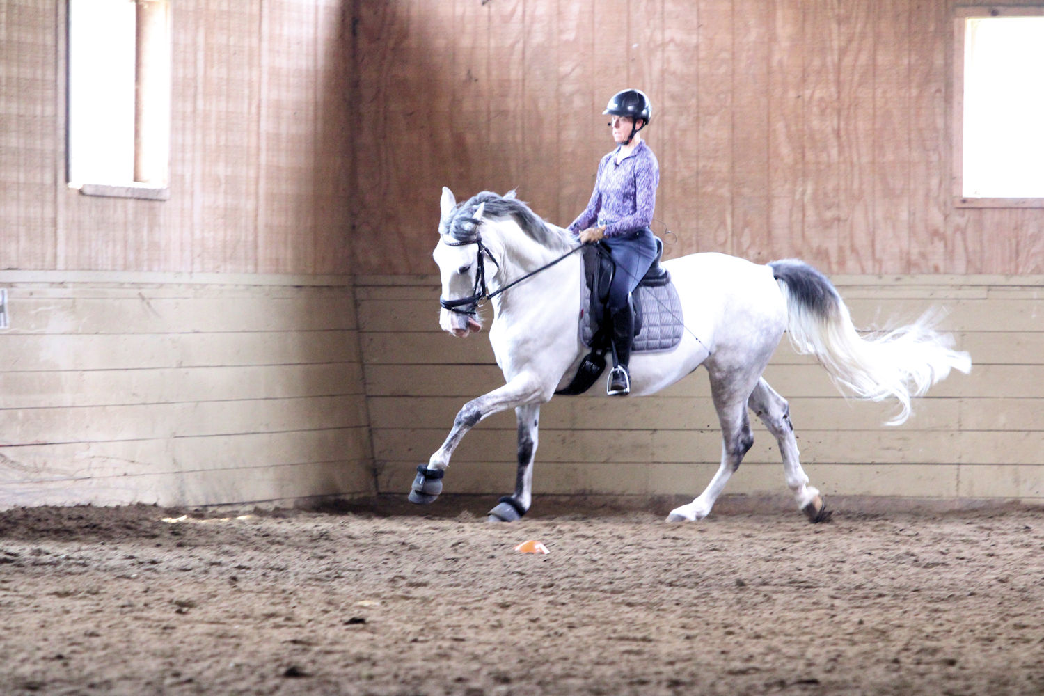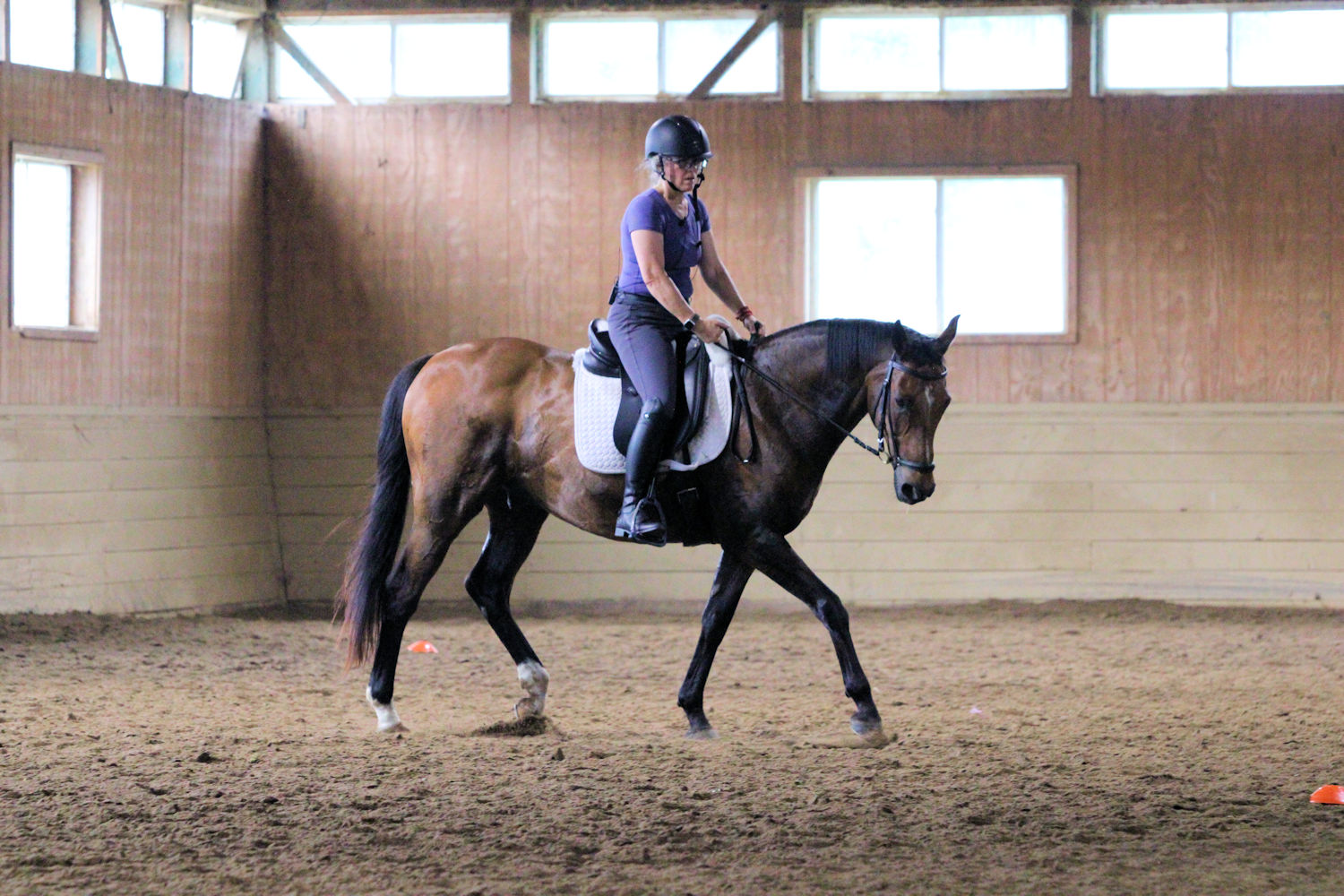 My friend Becky was able to bring her horse Cassian to fill the last spot of the day. They were caught outside tacking up in the middle of a downpour. They came in soaking wet and smiling. Her main goal is to eventually ride Cassian tackless so Beth had her begin with steering him around the arena while keeping the reins on his neck; only turning through the body. They did this for the warmup and moved on to pick up the reins and work on other things.
