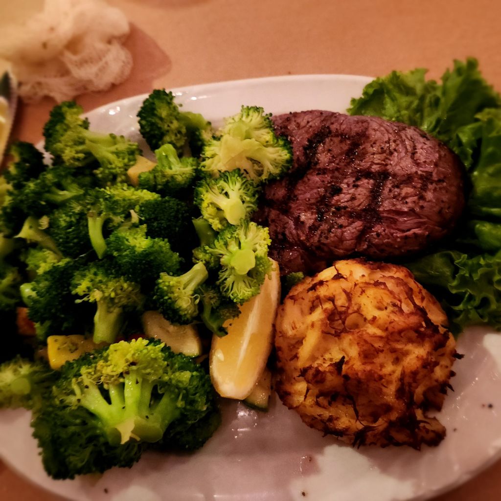 We drove around a bit more and had to be dropped off back at the entrance. From there we went into town to a famous restaurant called Woody’s Crab House. We ordered a crab and artichoke spinach dip and Malaina taught us how to eat Oysters. We each had one Chincoteague Salts oyster and one Blue Points oyster. For my first time eating raw oysters I did well. I didn’t taste much besides horseradish and brine and I didn’t give them any time to get a texture. For dinner I enjoyed “Steak and Cake” consisting of a rare 8oz sirloin (it was ok) and a fantastic crab cake. They are famous for a reason, the crab is fantastic!