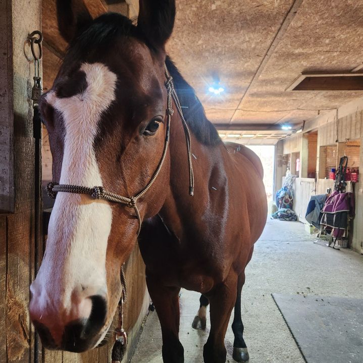 Stanley: I purchased him as a 6 year old thoroughbred for my first off-track restart. I bought him sight unseen and we loved each other immediately. He has a goofy personality, a wrench on his face, and a prominent sclera in his eye. He tries exceedingly hard to please and that necessitates me being extra mindful.
