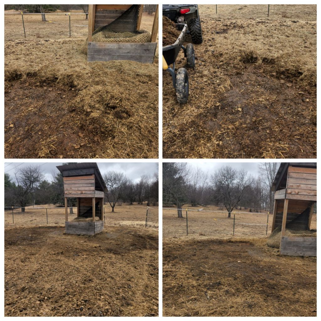 Just this past week I took a metal pitchfork, my giant Gorilla cart and the ATV and I removed TWENTY loads of the wasted hay. It was 6-8″ thick and came off if stubborn SHEETS. But since I have a nice stone base laid out I was able to get most of it. There was a single patch of ice buried under part of it that I was able to reveal. By next week it will be fully thawed and ready to be fully clean.