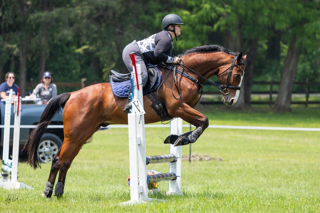 We warmed up wonderfully. We took a cross-rail off each direction. We took a vertical off each direction. Then we jumped a small oxer. Great!!! He was starting off wonderfully. He through in a few dramatic moments when I asked him to canter but otherwise he was feeling good. When it was our turn to jump we walked in, trotted past a bright yellow and black jump, and made our way. The signal (a duck call) sounded and we picked up a canter and rode to the 1st jump. Clear! We were doing it.