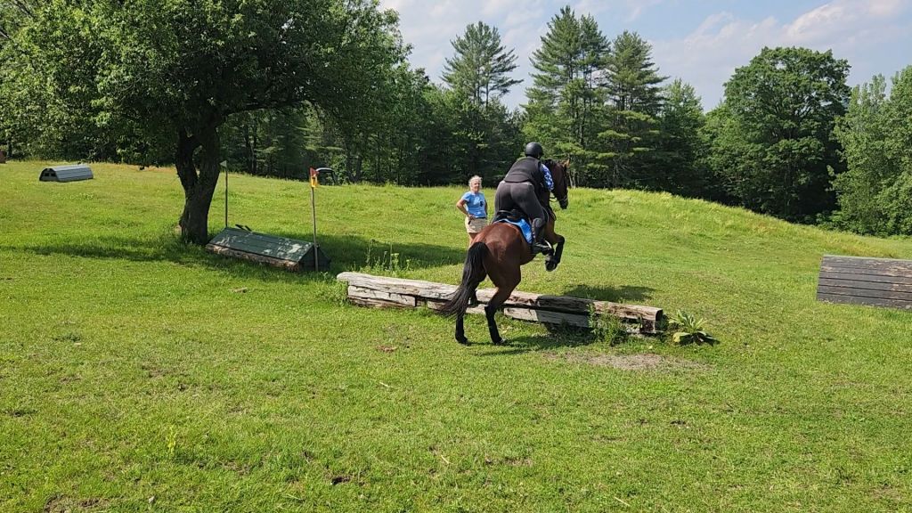 Next we tackled some low jumps. A combination of logs in both directions. A small log going uphill. Another small log farther away from the barn but within his eyeline. We ended on another jump, reasonably close to the barn. Heading toward the barn was no problem. When we turned around he questioned it. We reapproached and I added more leg. No problem.