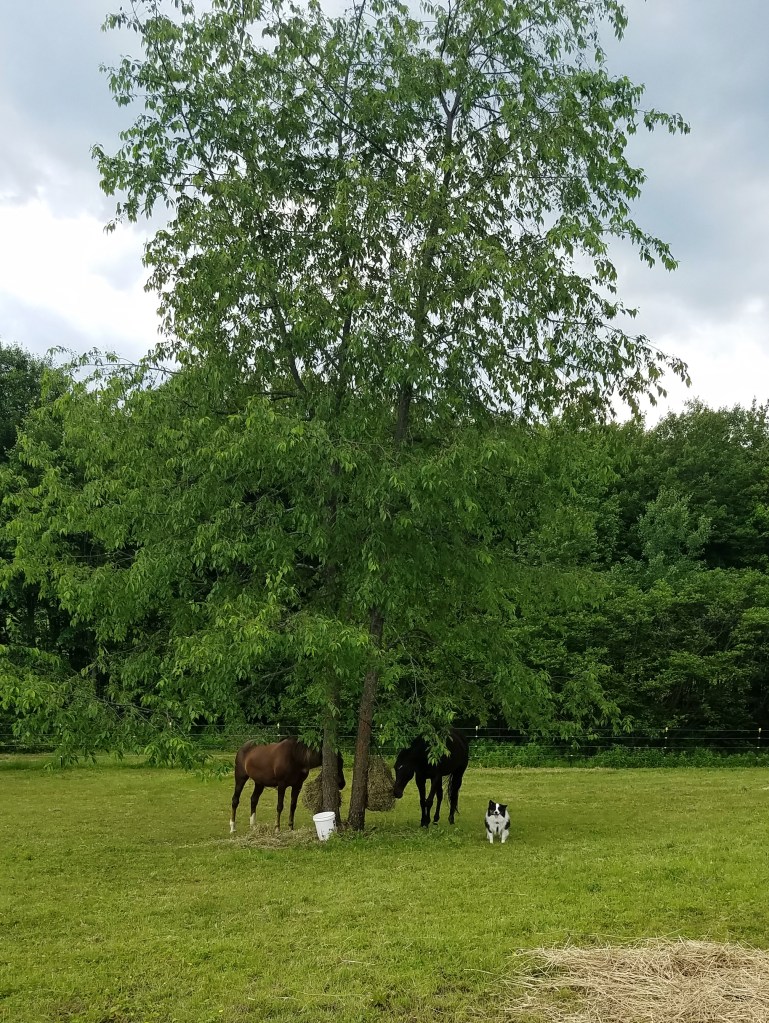Once I had the upper pasture installed, I ended up having two fosters move in and the old mare left. The three geldings LOVED their life and managed a lot better than simply having the two; it was a different dynamic. They played amongst themselves and frolicked. I also hung hay bags in different areas of the pasture from trees.