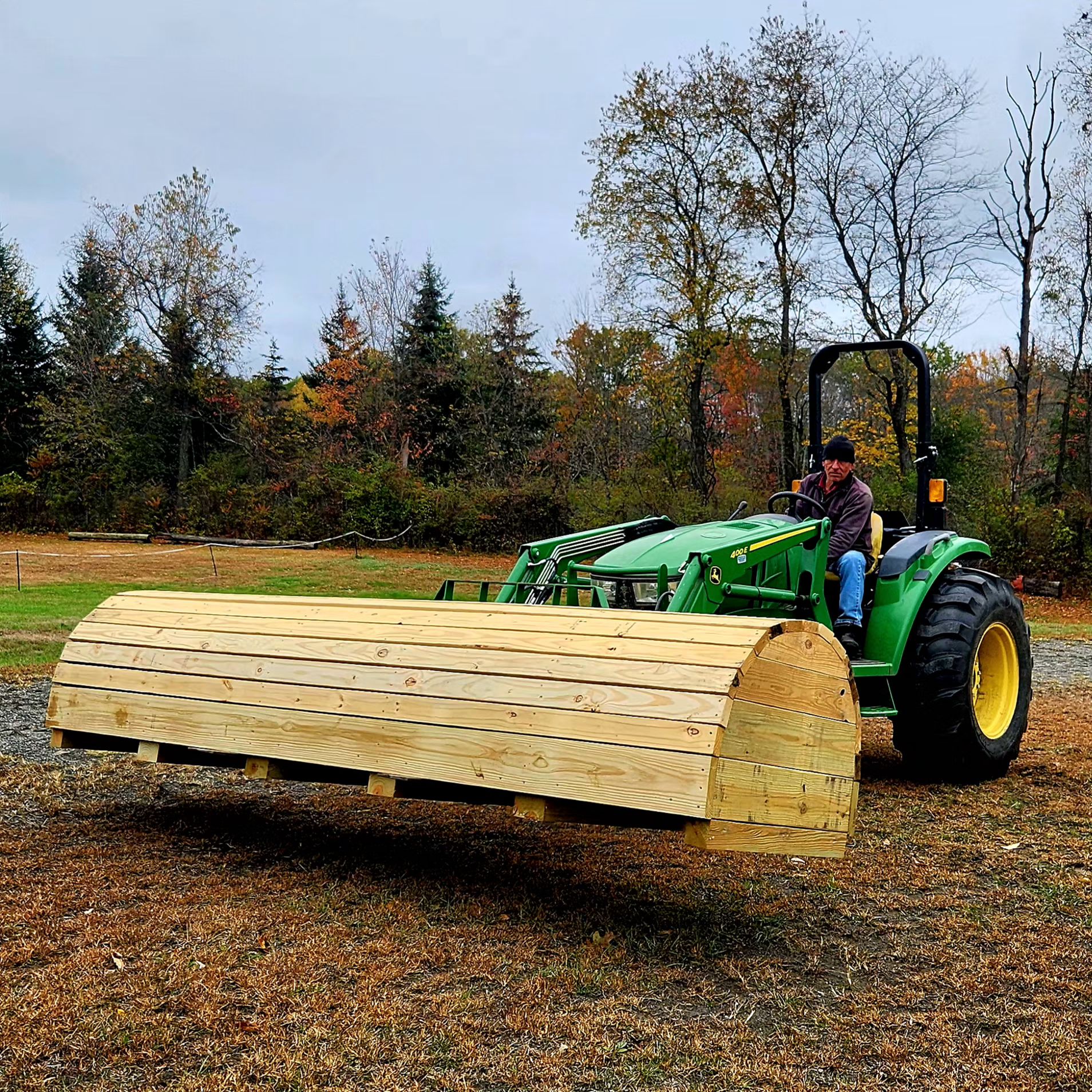 The final element of this big project was the rolltop. I was commissioned to build a beginner novice height rolltop 12ft wide. As always I build my cross country jumps at home first. Before delivery I label each board and disassemble and once again reassemble onsite. I was so incredibly lucky to have Suzanne traveling with me. She made an excellent assistant as I reconfigured each piece.