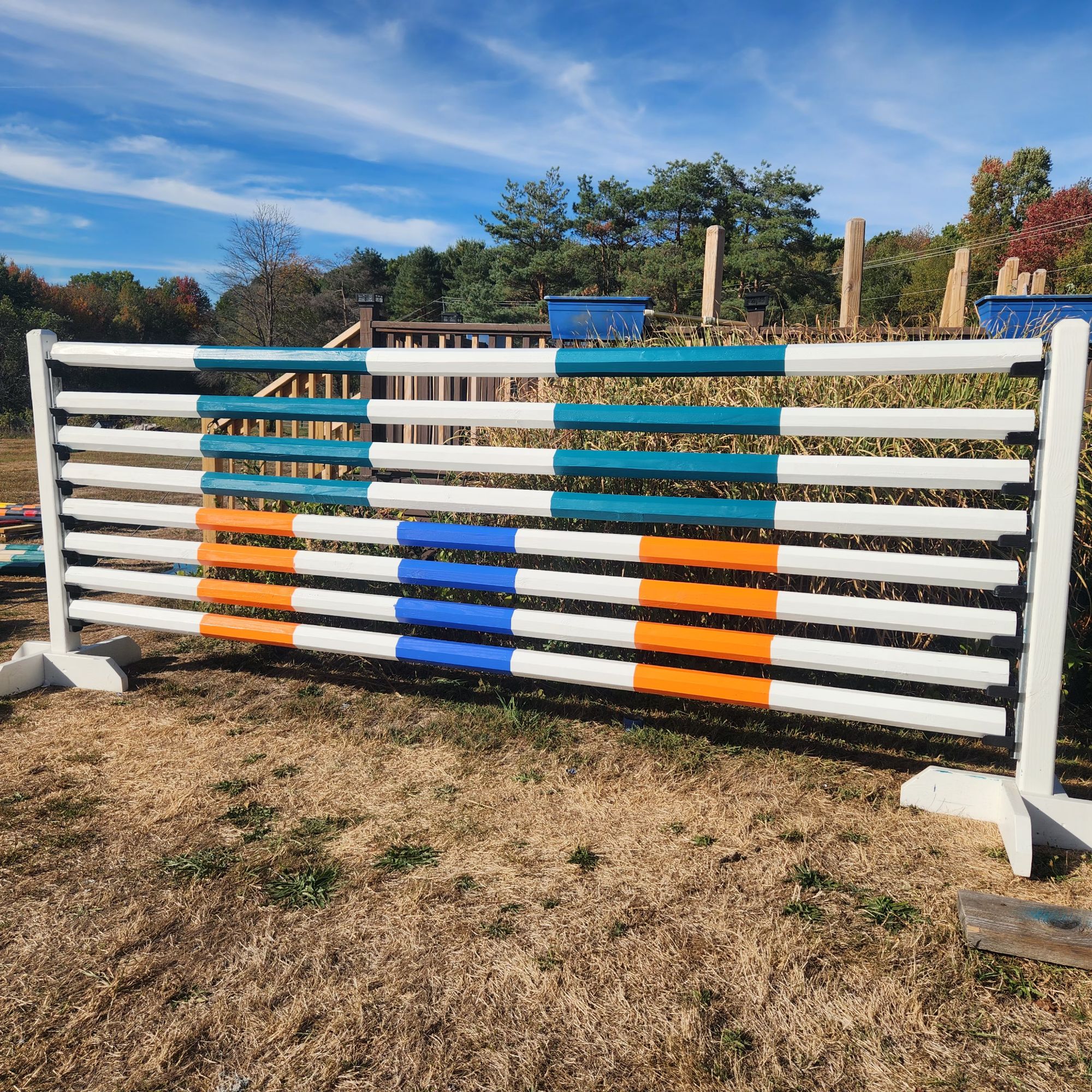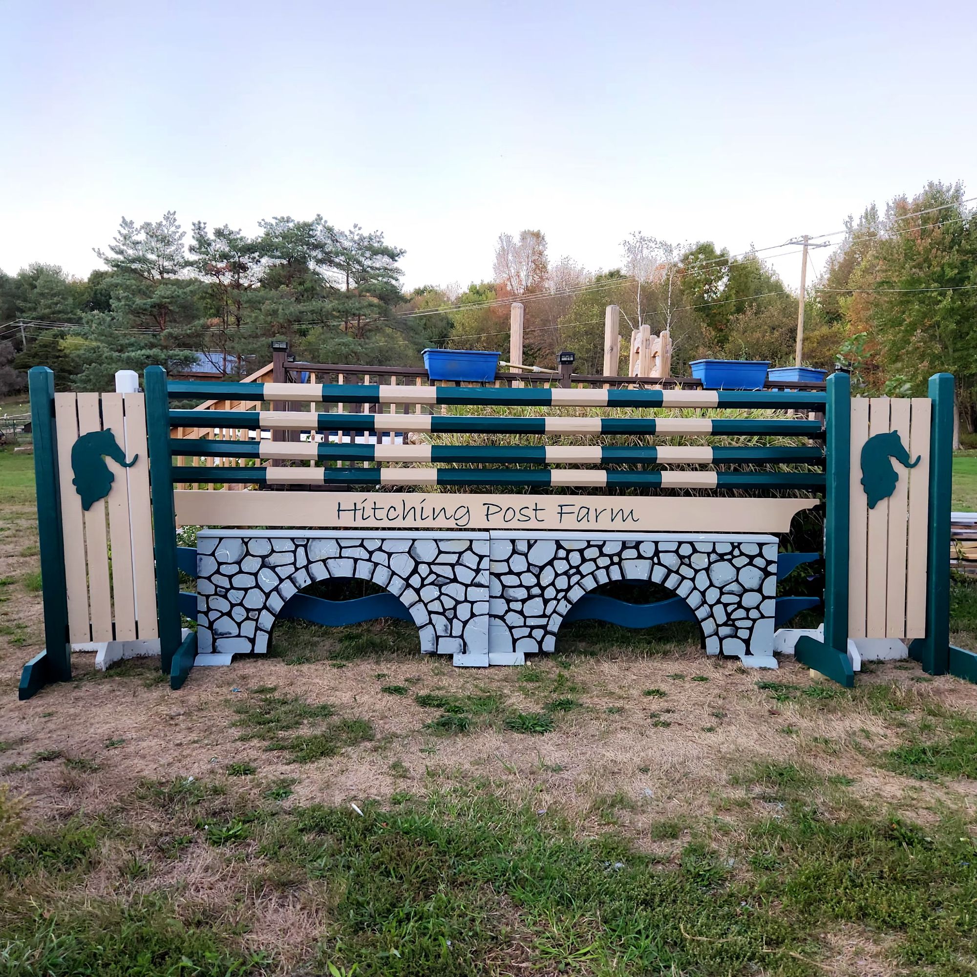 I was contacted to help add some jumps to our new friends at Hitching Post Farm in late summer. From a few poles it grew to 40 poles, 3 stadium jumps with all the filler, all painted, AND a rolltop for the cross country course.