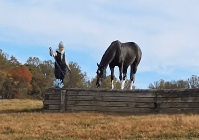 We took care of Tiger first. I didn’t bother with cleaning the stall since I’d be stripping it later. We got him walked and fed and fresh hay. We took a moment to admire the steeplechase jump…it was quite large by our own weenie standards and to think they gallop over this no problem.