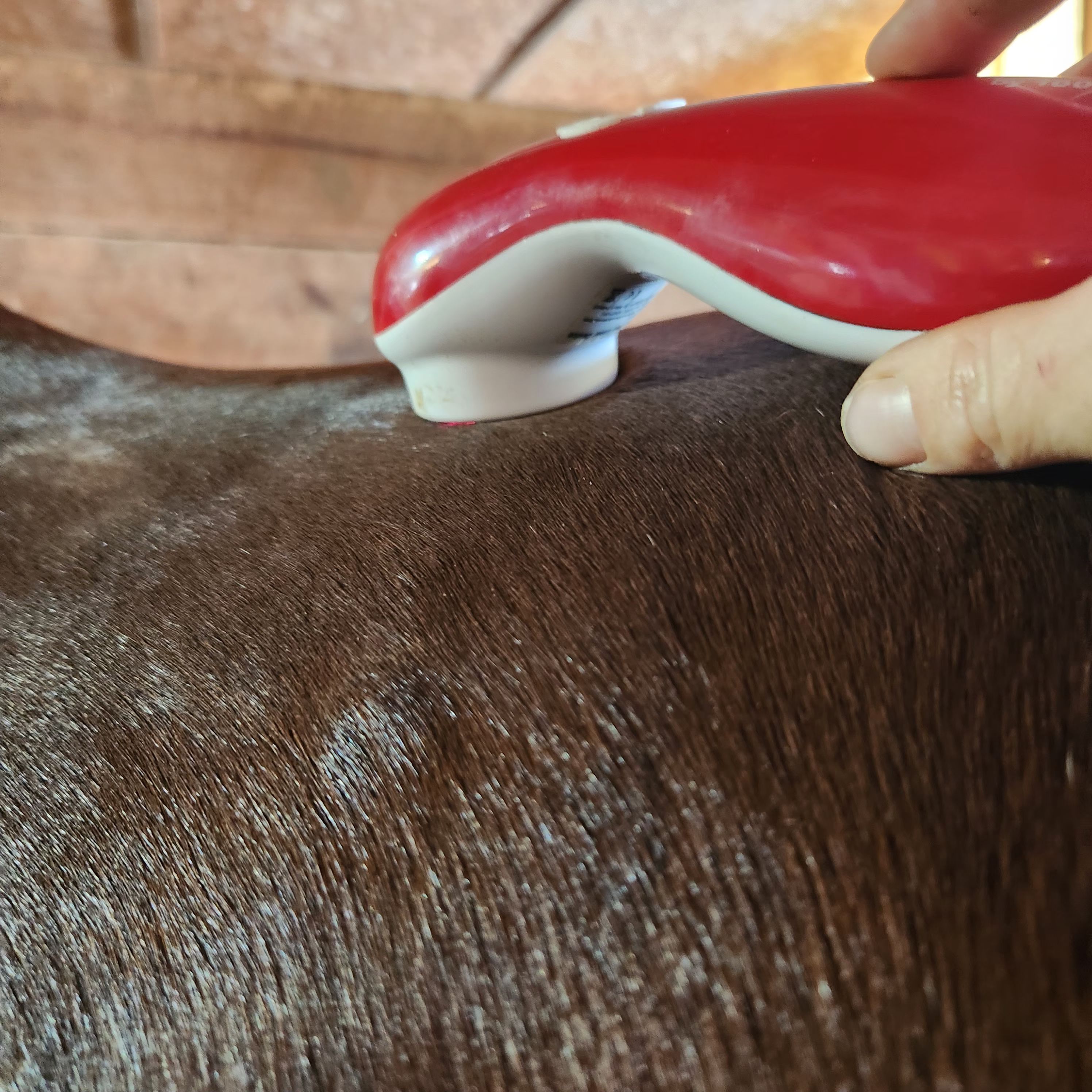 His bodyworker began to ultrasound the bumps to help them break up. At her recommendation I gave him a little time off until we could get the bumps a bit smaller. Our thought process being that as they were already elevated and present the pressure and friction can only drag them out longer. In addition to her ultrasound I was able to use my own laser on them. I own a an EquiLaser….a class 3 laser sold by 100x horse supplements.