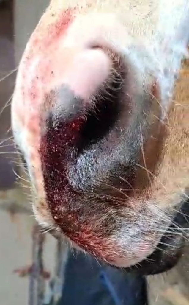 During one of our sub-freezing cold stretches I got a text from the barn owner. It was an image and a video of Stanley…a close up of a bloody left nostril. It wasn’t running, not gushing…but it was a slow drip. Steady enough to be concerning. We watched it throughout the day. The next day….same thing. We also learned that one of the people doing chores the night before we initially saw it saw him with a bloody nostril too but hadn’t alerted us to it. By now we were at Friday and it was day 3 of Stanley having a bloody left nostril.
