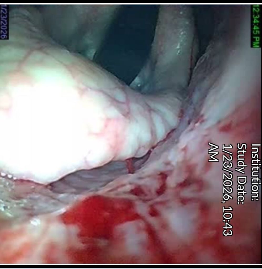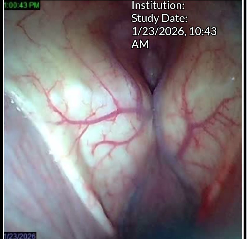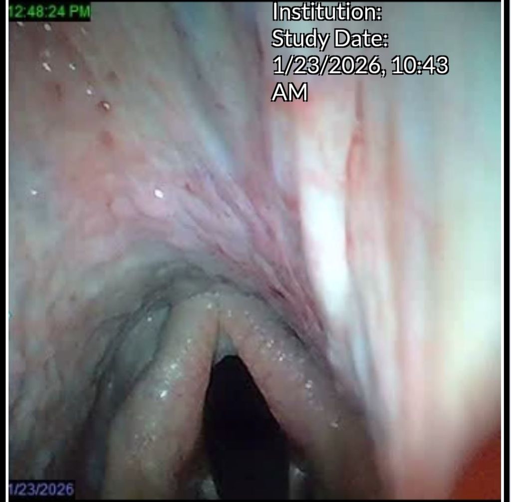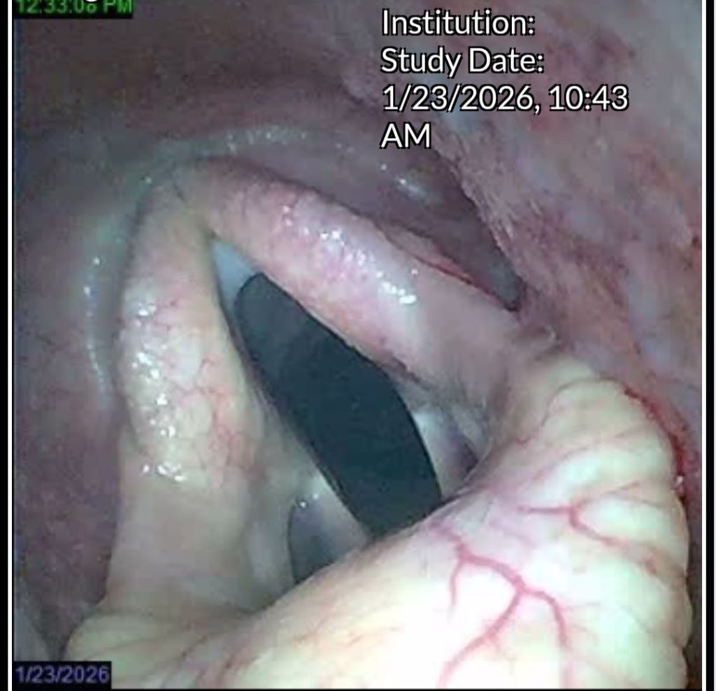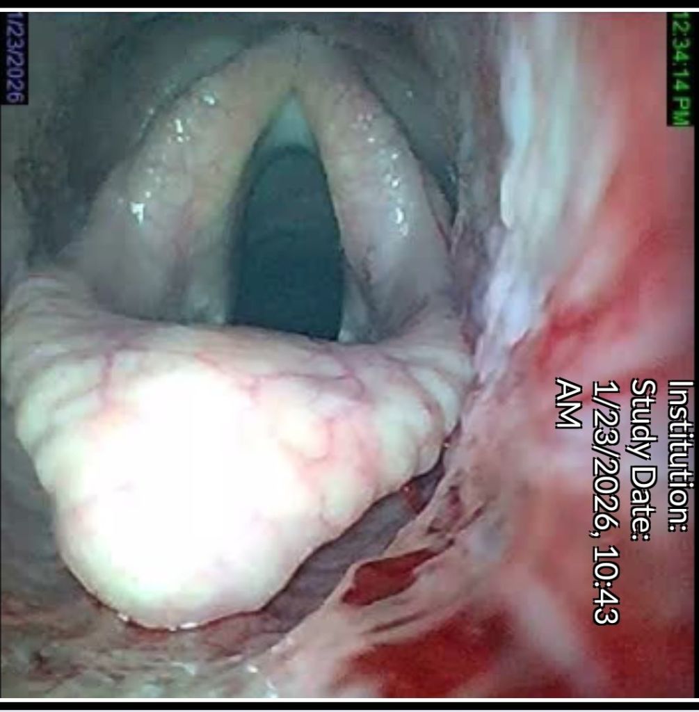 The vet explained that she wanted to look at the guttural pouches, the ethmoids, the pharynx/larynx, the epiglottis. The airways were clear. The guttural pouches looked good. No hematoma seen on the ethmoids. What we found were lesions in the airway.