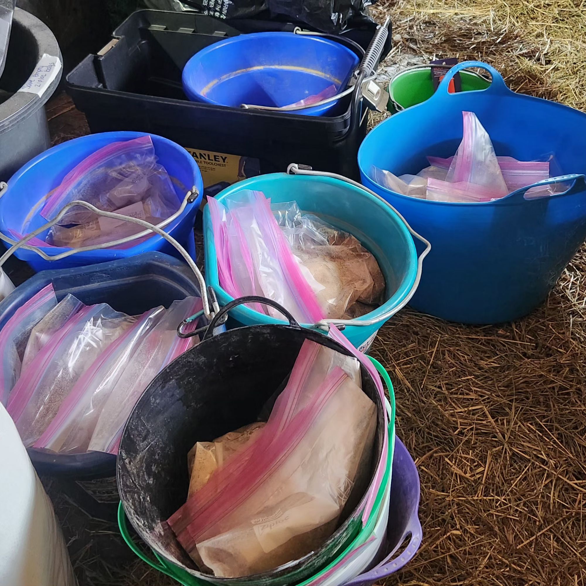 I prepped enough feedbags for Stanley for the trip…and also enough to last Tiger and Suzanne’s new mare Fern since I prep their supplements at home. Three weeks of supplements for three horses….126 bags of supplements (2 feedings a day for three horses over 21 days)!