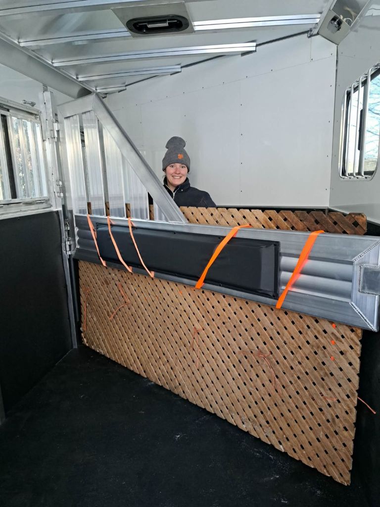 I mounted a thick piece of sturdy lattice to the front stall in my trailer and loaded it with the hay I’d need for the trip.