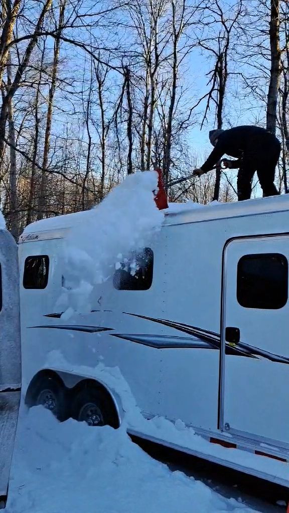 I shoveled off the snow from the top of my trailer’s roof. Suzanne helped lift me in the bucket of her tractor to get up there!
