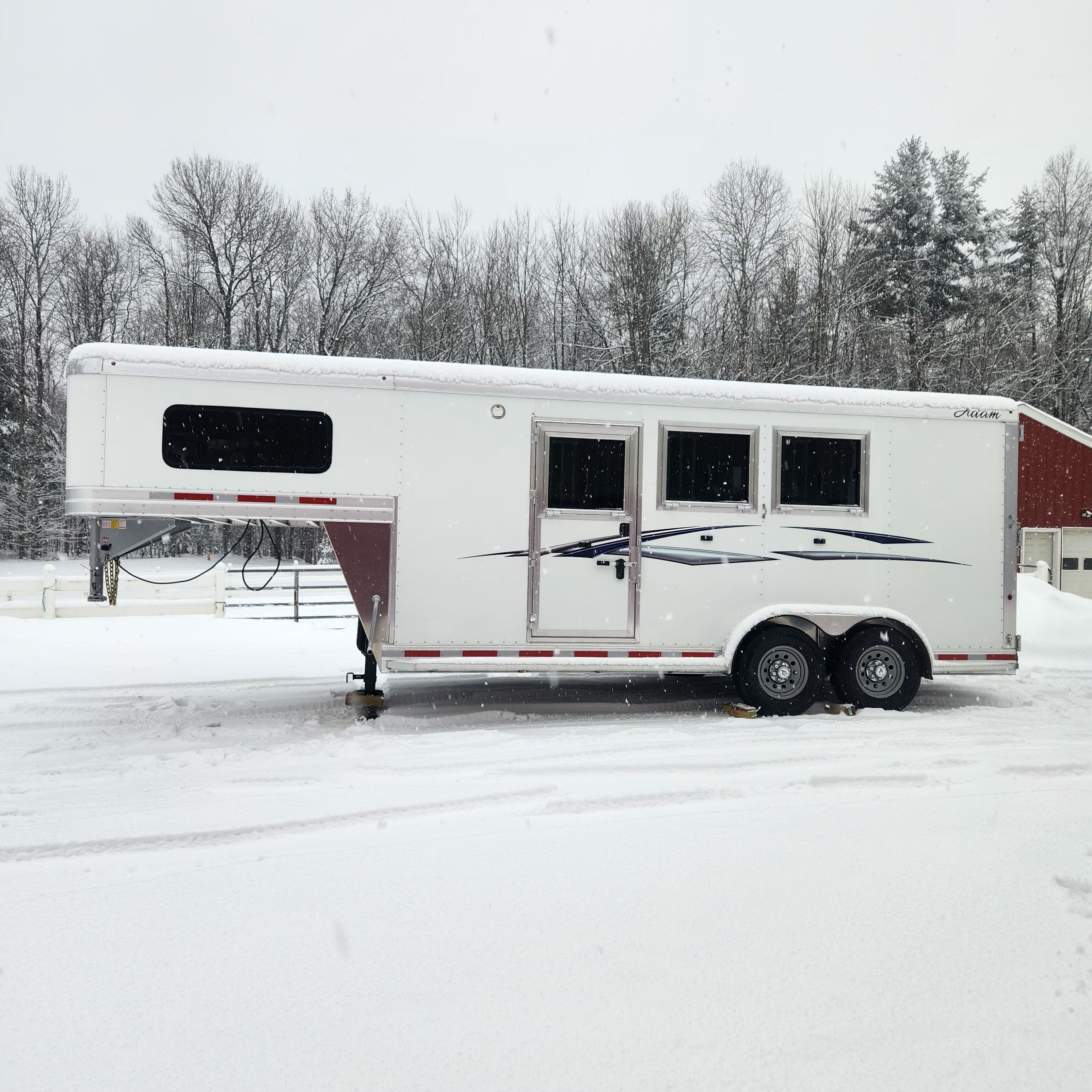 I got out of work four hours early on Friday in order to hook up my trailer in the light of day and haul it out from the parking spot. It was rain/snowing when I arrived and the snowpack we had over the winter so far made it tricky to get in and out. I first had to jack the trailer up extraordinarily high just to fit the lip of the tailgate under…then as I got into position the back of the truck dipped down (since the gooseneck protected that section from snowfall the heigh difference was extreme). It felt like forever getting everything lined up just right but I did get it done. I had to put my truck in four wheel and it still fishtailed trying to haul out of the space. I reversed a hair and tried again and finally the trailer was rolling. I very carefully drove through a few inches of fresh heavy snow and placed it on a level spot accessible for hooking up in the morning and for loading Stanley.