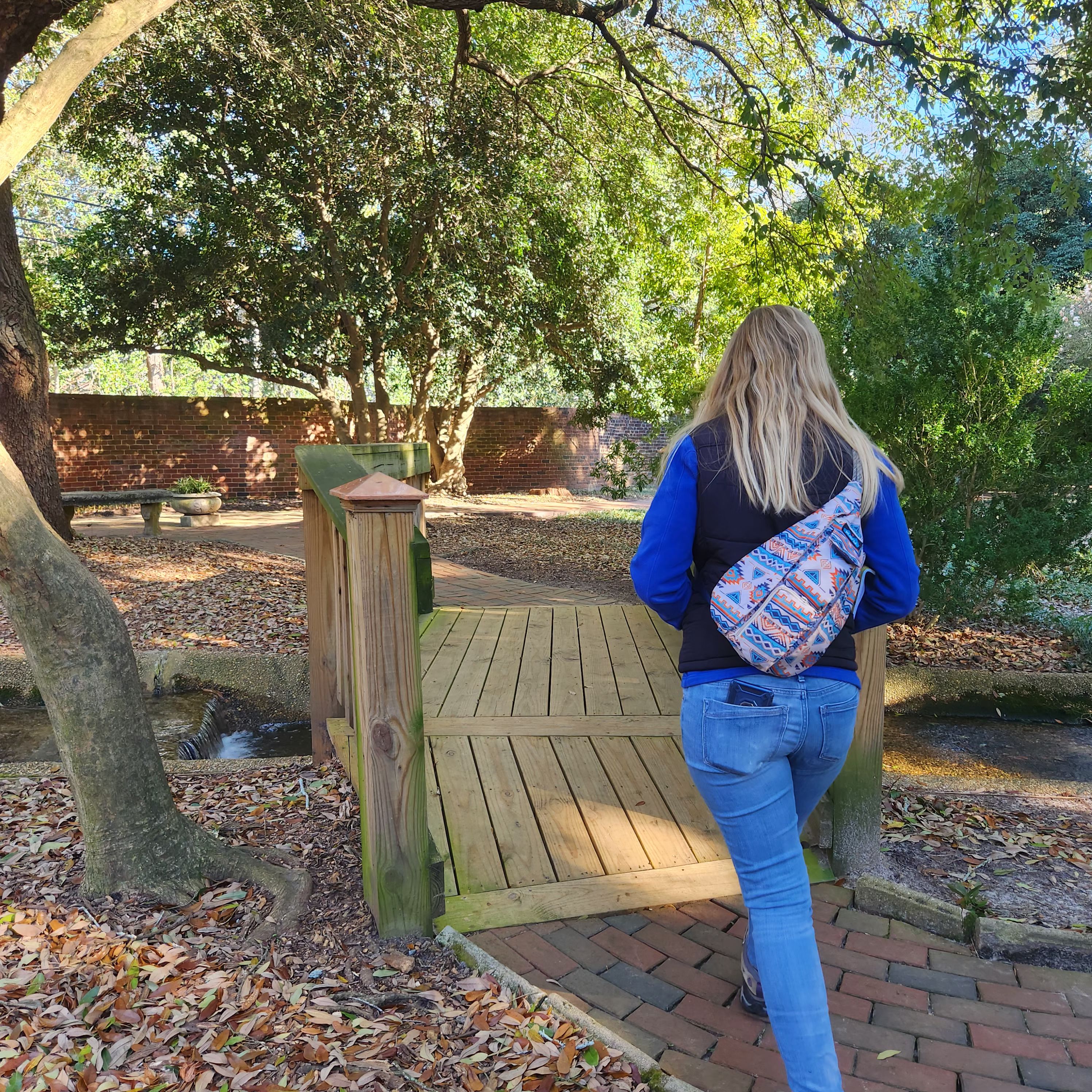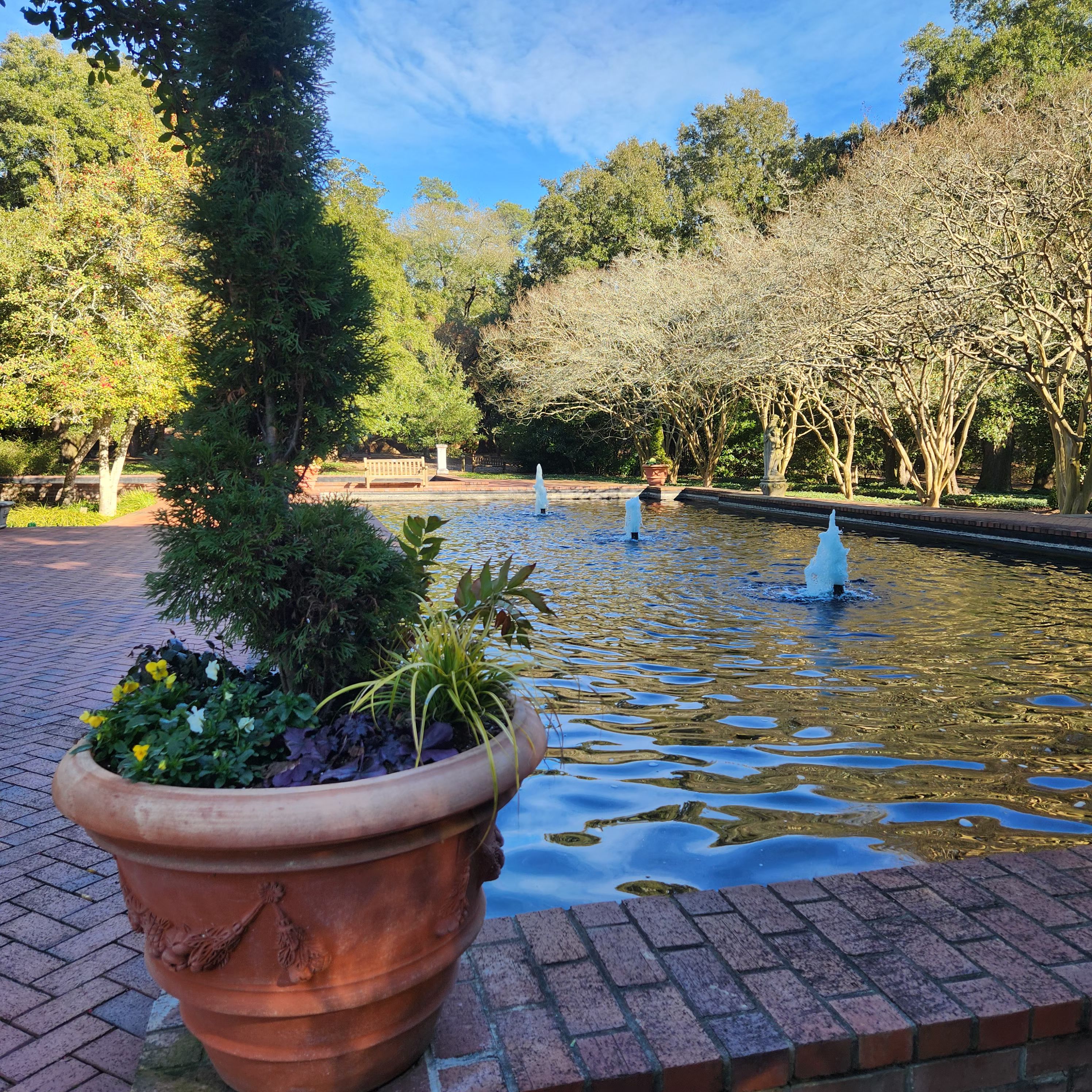 After the lesson we went to the Aiken Thoroughbred Racing Museum at the Hopelands Gardens. The volunteer inside was lovely and excited to share the history of the property with us. We explored inside on our own. They featured hall of fame horses. Award winning jockeys and trainers. There was a kids section. It was a lovely little museum and we were glad to go. Outside we walked the fabulous garden where we could enjoy the water fountains and some flowers already in bloom. I spotted a fat Koi in the pond. We took our time to take in the sights and outdoor air as we sat in the swings…sat on the benches overlooking the pond. We walked the labyrinth…a pattern of colored bricks winding eventually to the center.