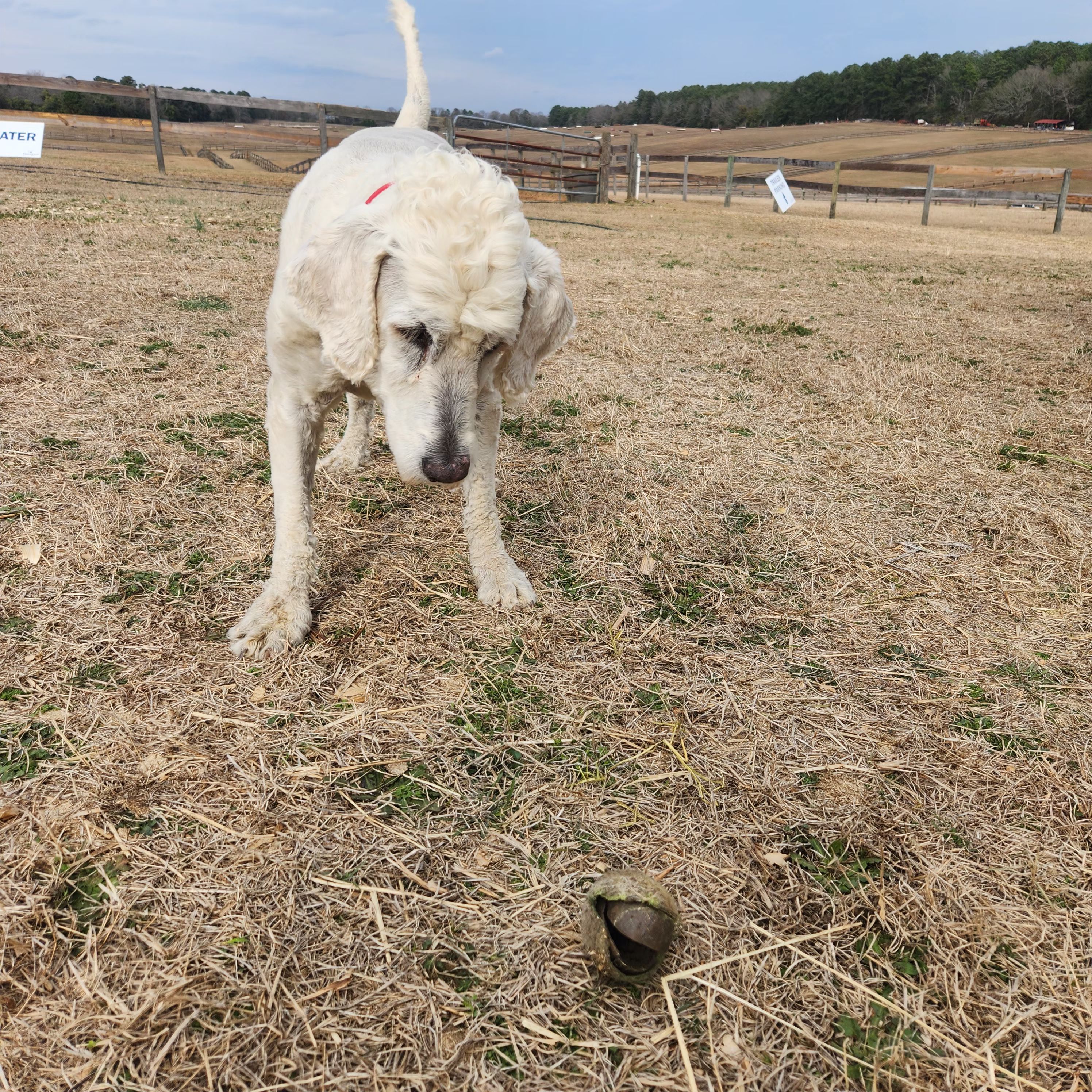 Suzanne had an amazing hound dog for 15 years named Jade. Last year we said goodbye to her as old age took her away. Jade loved chasing tennis balls. She’d run and play all day long if you’d throw it. She would even place the ball at your feet…nose it to you…or put the ball somewhere you can’t ignore like the wheelbarrow or your shoes. Out of nowhere a white dog visited my trailer while I was trying to calm nerves. The dog had the run of the whole facility but cam to me. It carried an old tennis ball and placed it on the doorway to my changing room. I reached for it and the dog looked eagerly…ready for me to throw it. It returned and dropped the ball in front of me, then nosed it forward to my feet. This dog is Jade visiting me, to remind me to take a breathe and enjoy myself. To help me calm down, smile, and live in the moment.