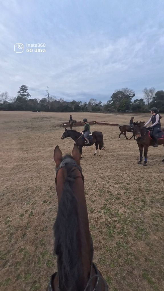 With Stanley ramping up (he wasn’t bad yet but I didn’t want to wait until it got bad) I had to pause my games with this sweet dog and put his bridle on. We made our way over to the group; Andrea, Kate, Liv, and Juliana were just about ready with their horses. We mounted and the five of us rode out to the cross country course together.
