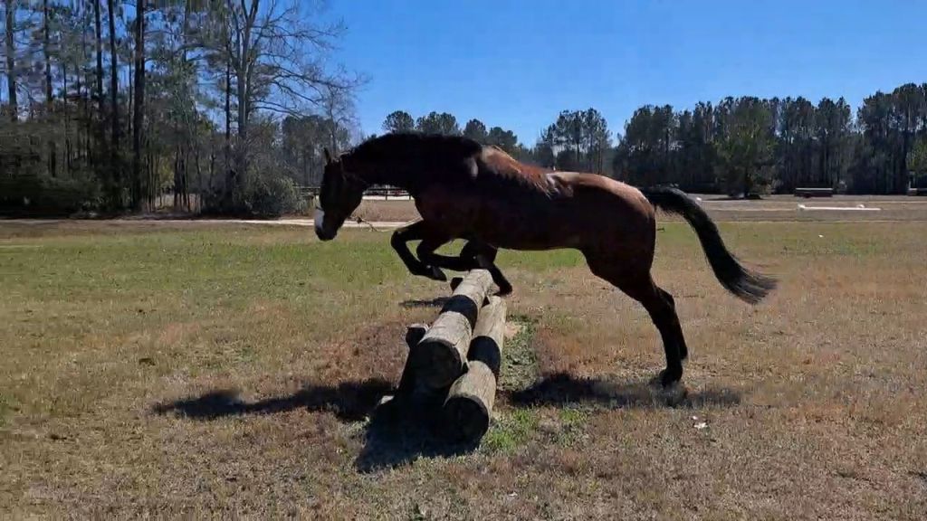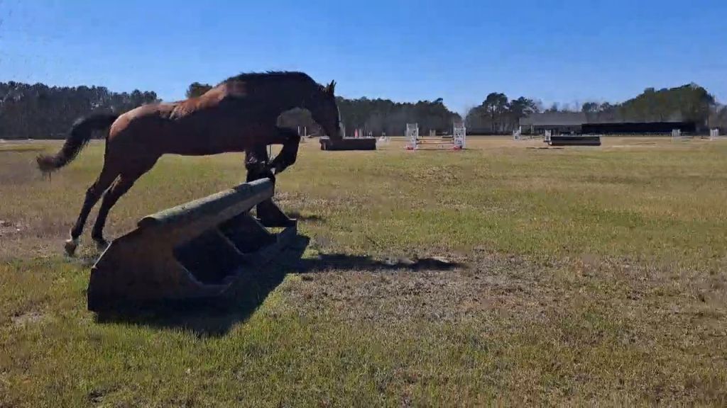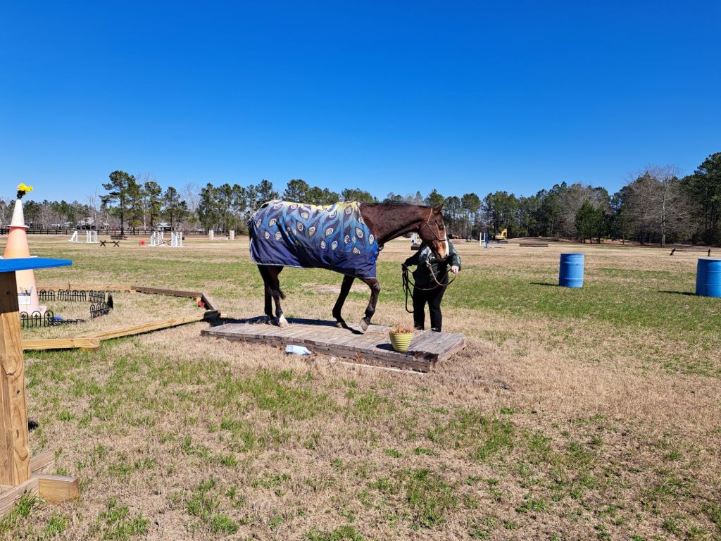 On Monday I wanted to stay off Stanley’s back as he settled in, so we hand walked him down to the shared arenas. The community boasts a dressage court with mirrors, a stadium ring, a working equitation area, and a cross country course….accessible through miles of bridle paths throughout the community. We took the bridle path that led us to the XC course…I walked him over some poles that were laid out on the ground. We visited the working equitation areas where I had him circle barrels. I did the figure 8 around the barrels like Tik Maynard often does in his clinics. I sent Stanley to investigate objects that I had placed a treat on. I backed him in a figure 8 around the barrels. We crossed a bridge. A teeter bridge. I then offered him a bit of lunging and sent him over a log jump. Then a cabin. He even a beginner novice looking rolltop. Stanley was thrilled to be moving his legs and stretching his back out. He added exuberance and a few head shakes to work out some of the stiffness. His neck and body were quite stiff after all that time in the trailer.