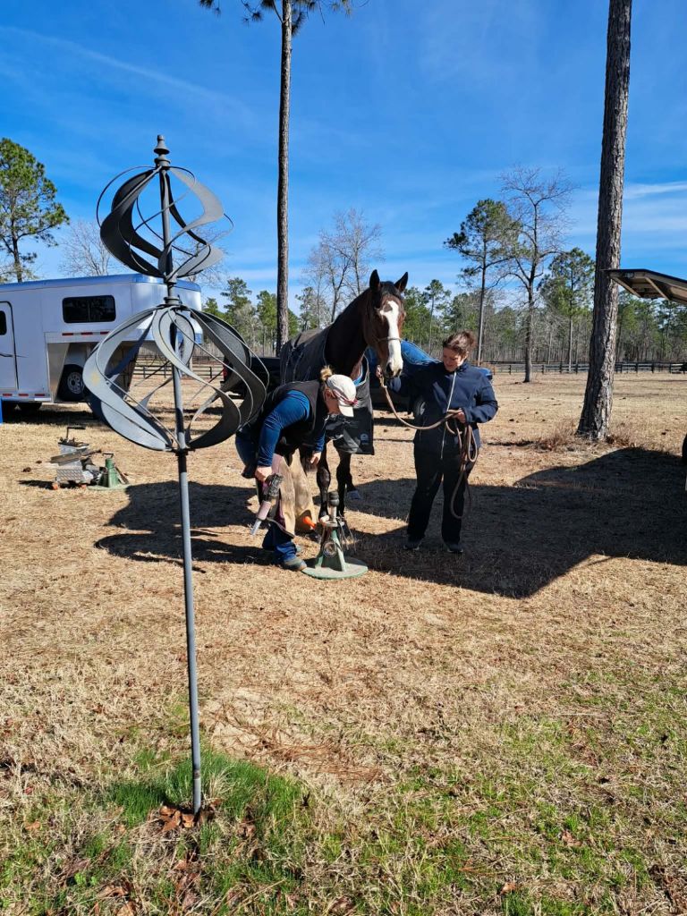 Tuesday morning I had the pleasure of getting to see one of my longest time friends. Ashley is a farrier who recently made the move to Aiken. I’ve known her for decades since we were playing on the teeter totter before school and exploring an abandoned horse barn near our house. I asked her to give Stanley some shiny new shoes for our stay. You might remember when I interviewed and rode along with her years ago (Interview With a Farrier, A Farrier’s Assistant).