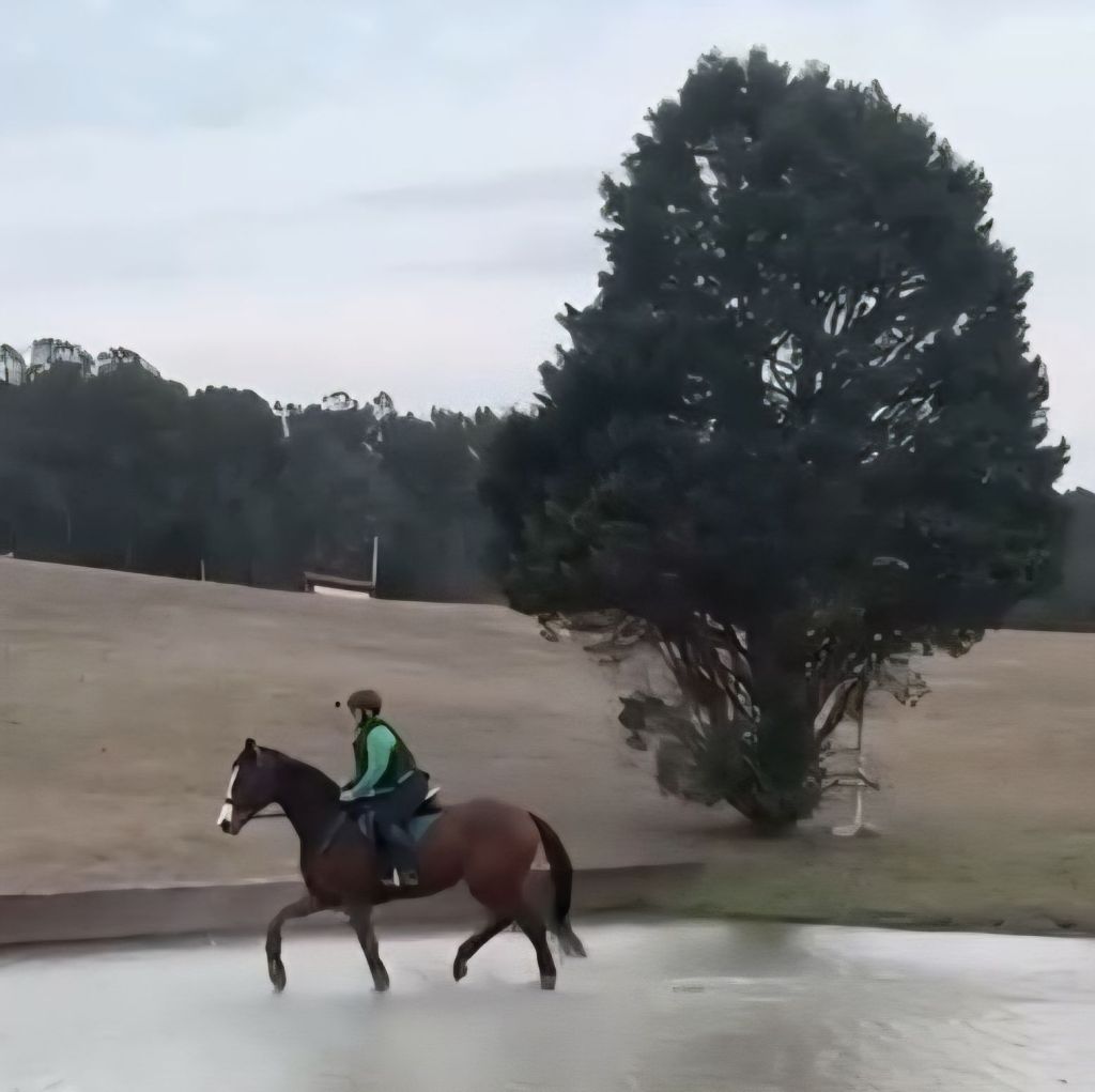We schooled in the field to warm up. We hopped a log. We went both up AND down a bank. Coming up to the water he had moments of hesitation but he never backed up. Once he was in we were able to smoothly go in and out of the complex at a walk and trot. He began to enjoy it.